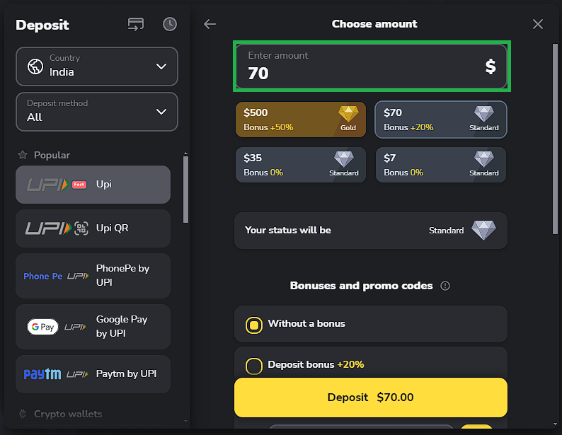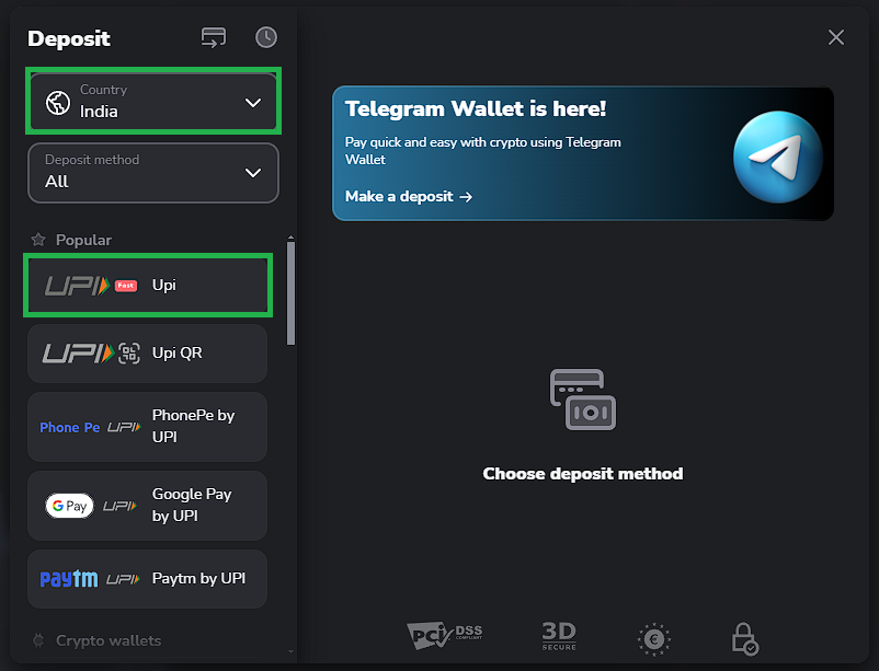 - In the traderoom, click the “Deposit” button in the top right corner of the screen. Choose your country and the payment method you’ve decided to make a deposit with.