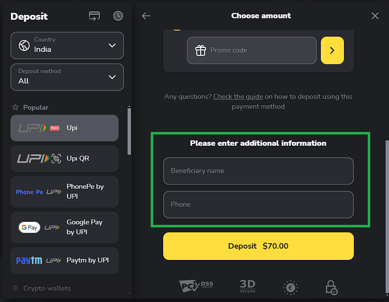 Enter your deposit amount, scroll down, enter additional information and click “Deposit”.