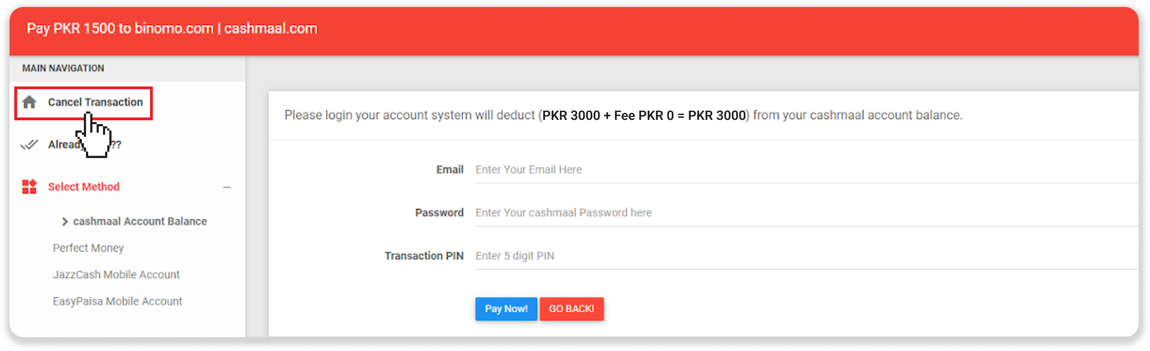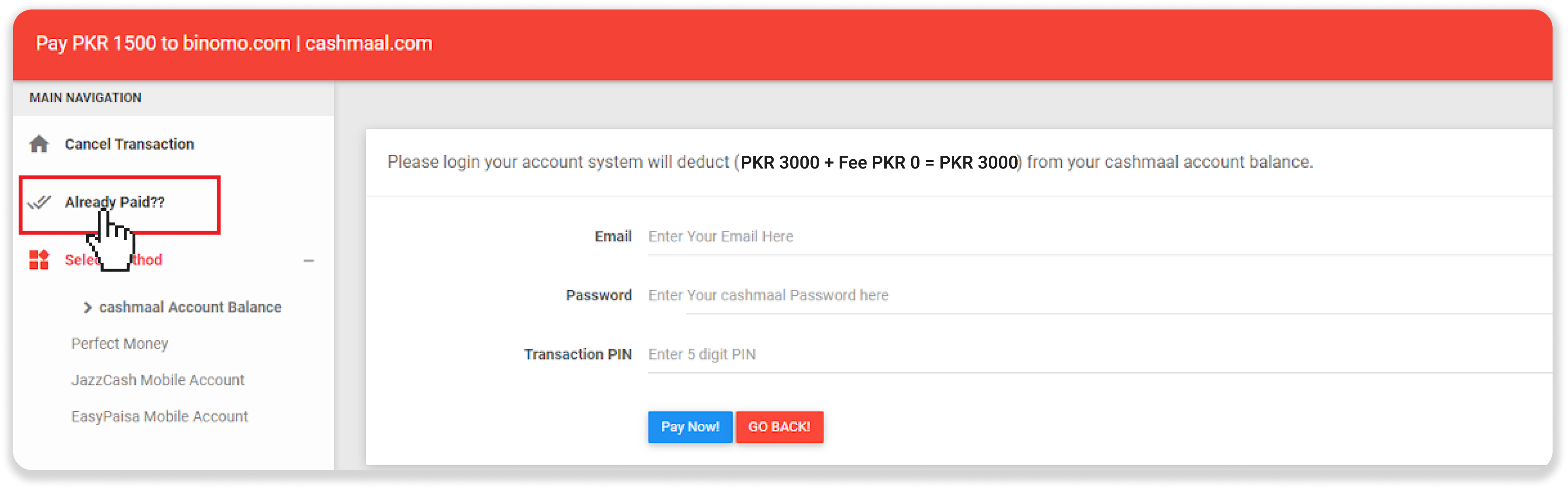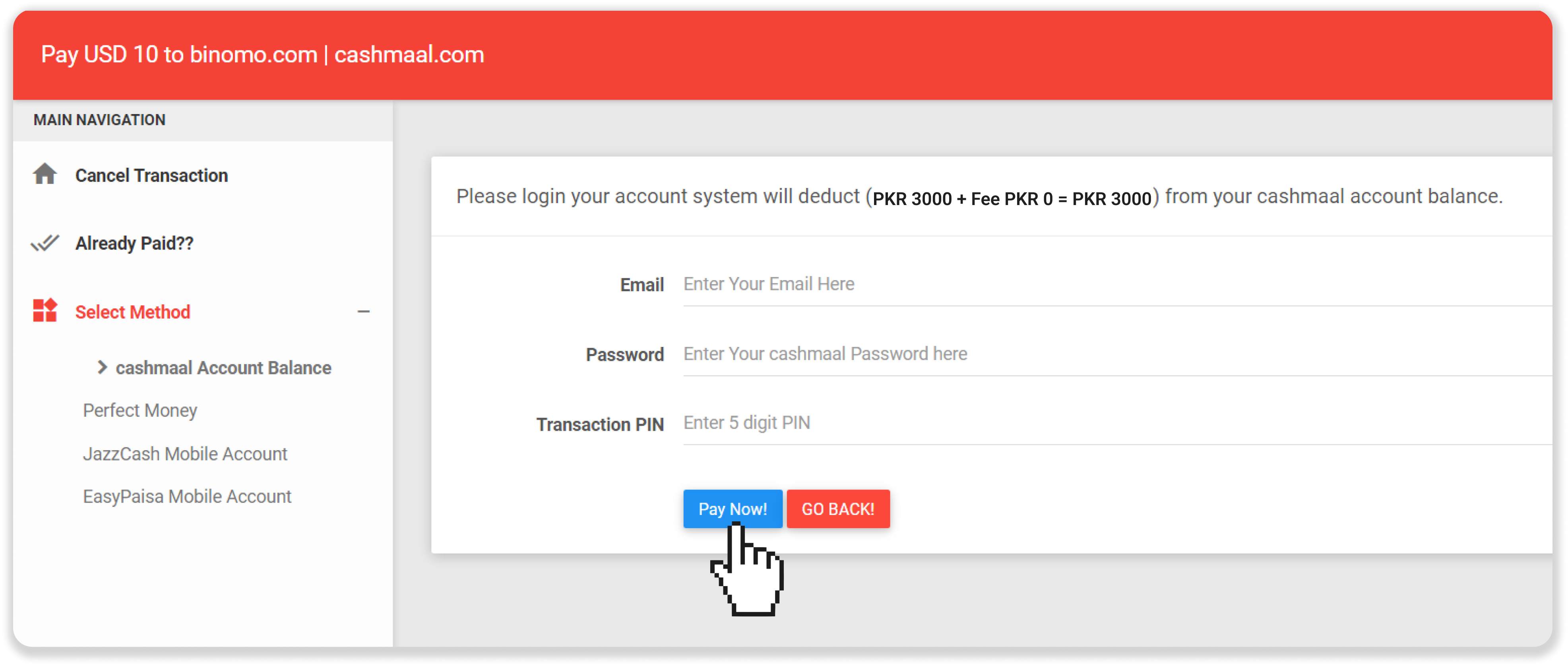 3. Enter CashMaal login details and PIN, and click on the “Pay Now” button.