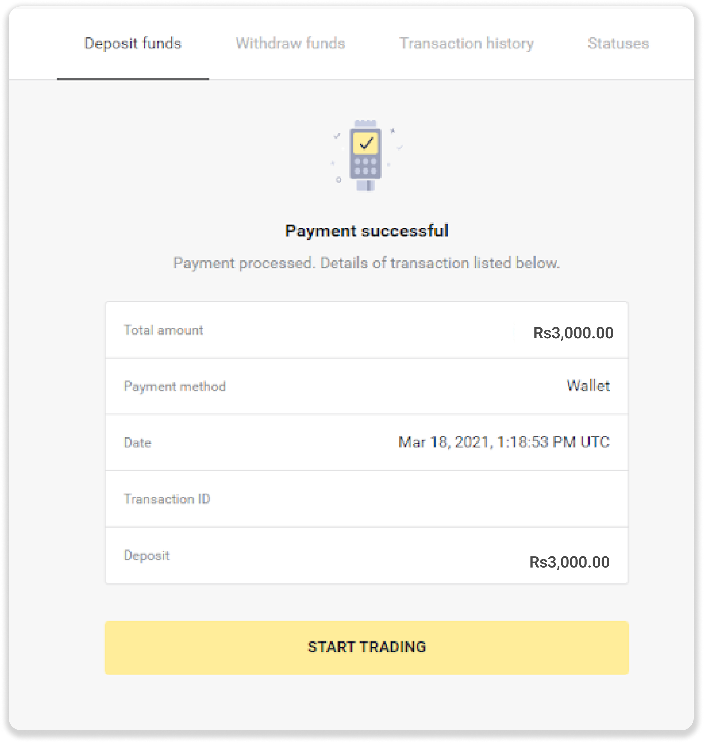 6. Now you have successfully deposited funds to your Binomo account. Click on the “Complete My Transaction” button.