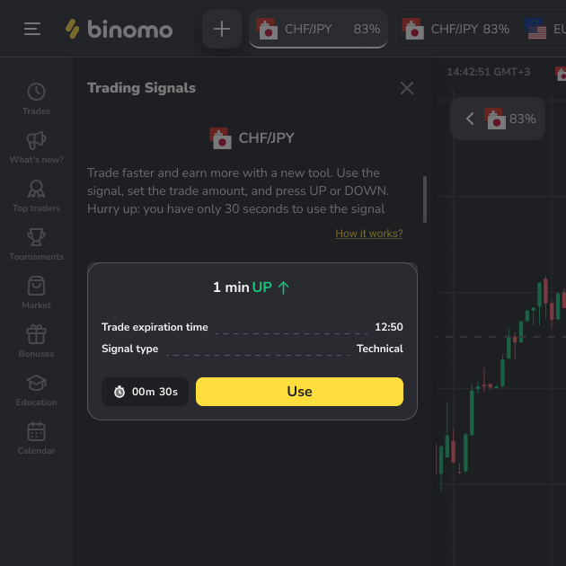 For now, Trading Signals is only on the desktop version of Binomo. Please switch to the new chart version to turn it on. The old chart version does not support it because it can’t provide the best trading experience.