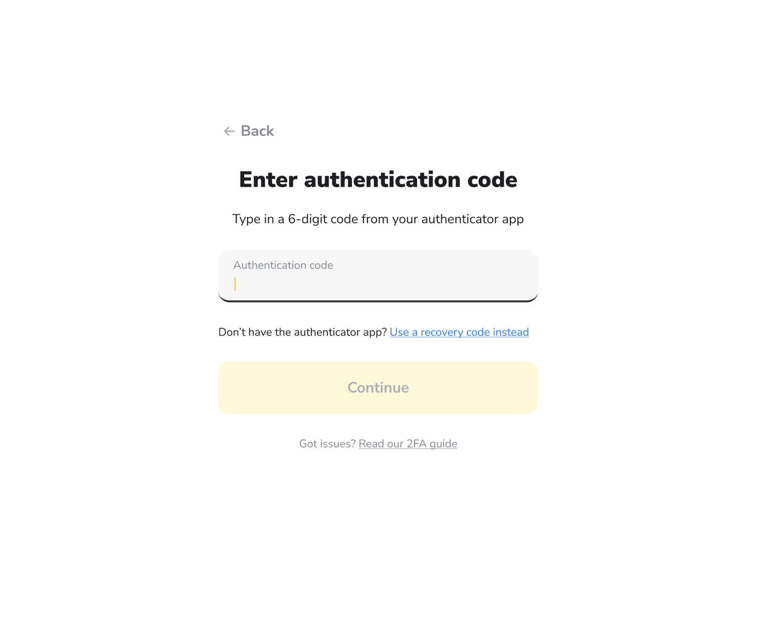 If you can’t use the authentication app, enter the recovery code instead. Remember that recovery codes are one-time, so regularly update them. Always keep the codes in a safe place not to lose them.