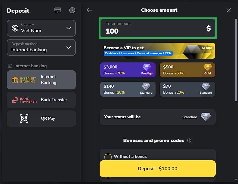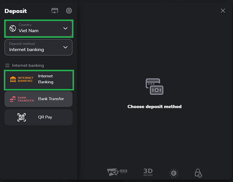 1. In the traderoom, click the “Deposit” button in the top right corner of the screen. Choose your country and the payment method you’ve decided to make a deposit with.