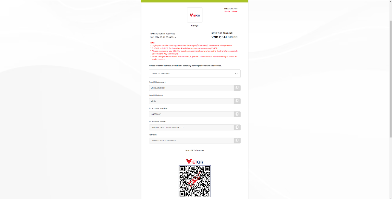 4.1 If you are using Viet QR, you will be redirected to the new page. Scan the QR code, or make a payment transfer to the bank account with the details from the table: