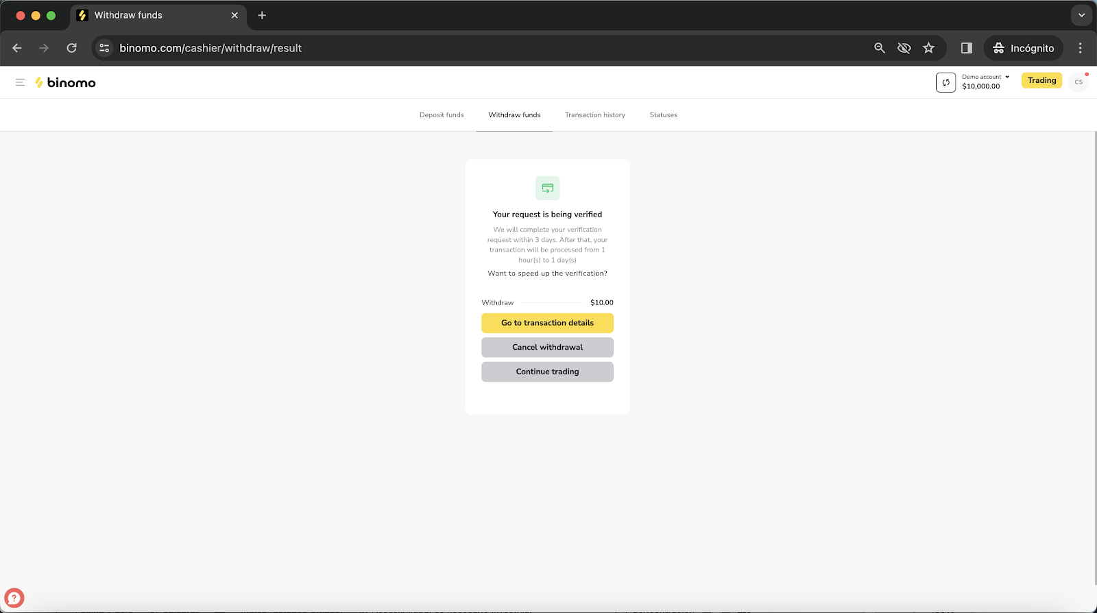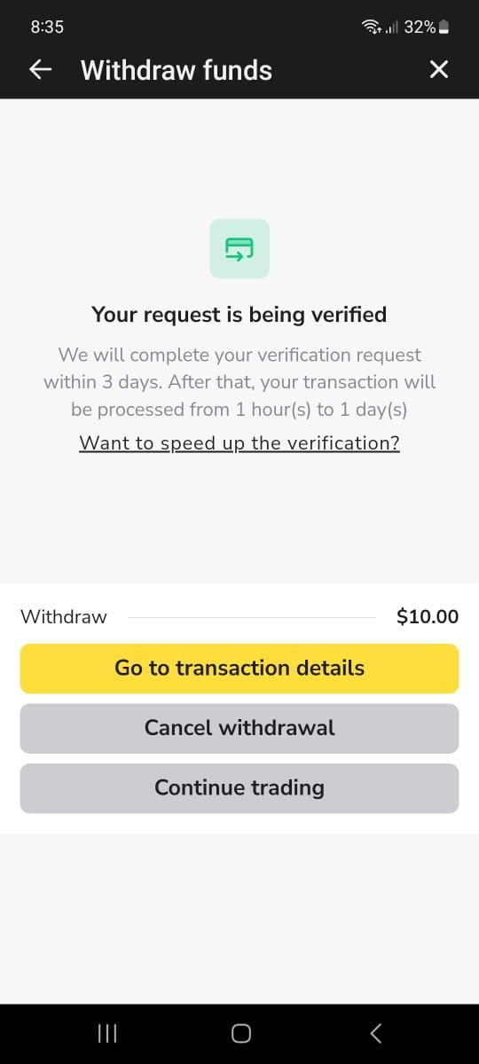- Once the information has been entered, a new window will appear stating that the withdrawal request its being verified.