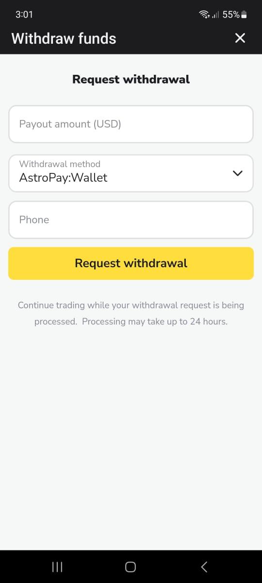 - Enter the withdraw amount and the phone number associated to your Astropay wallet