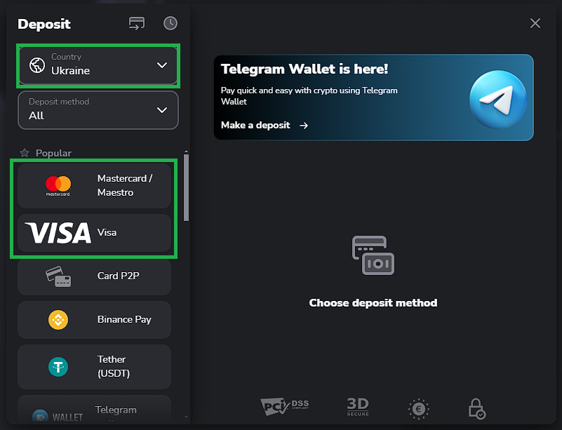 1. In the traderoom, click the “Deposit” button in the top right corner of the screen. Choose your country and the payment method you’ve decided to make a deposit with.