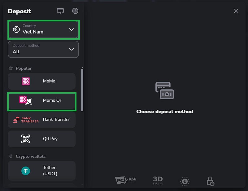 1. In the traderoom, click the “Deposit” button in the top right corner of the screen. Choose your country and the payment method you’ve decided to make a deposit with.