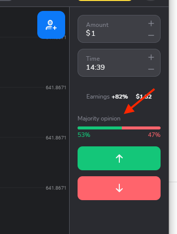 The majority opinion shows you what choices (up or down) other traders are making at the current time on the selected asset. On the left side of the graph, it shows how many traders forecast the chart will go up, and on the right side, the percentage of traders who think it will go down. It is up to you whether to include their opinion in your trading or not.