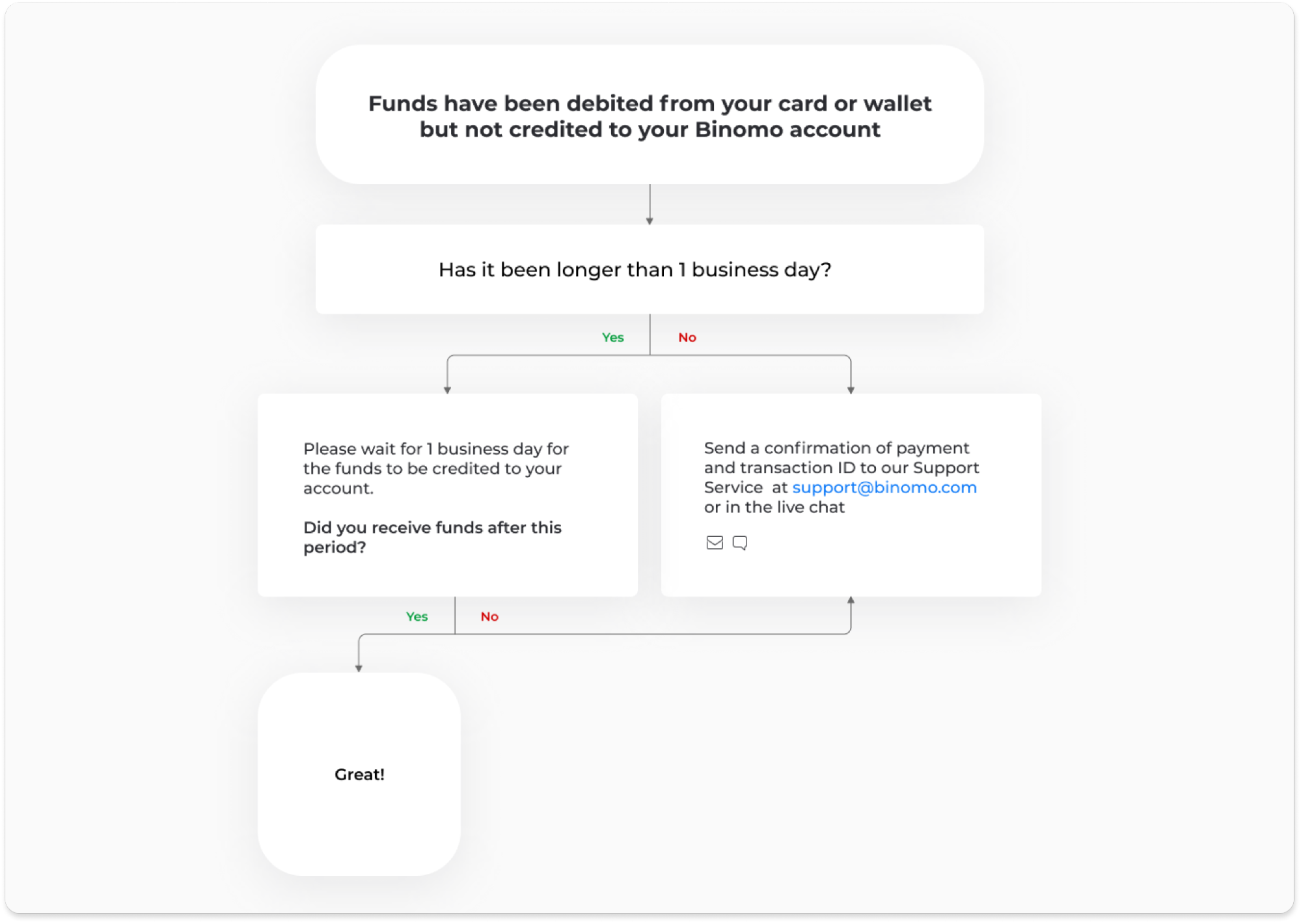 - Funds have been debited but not credited to the Binomo account. The flowchart below shows how to solve this problem.