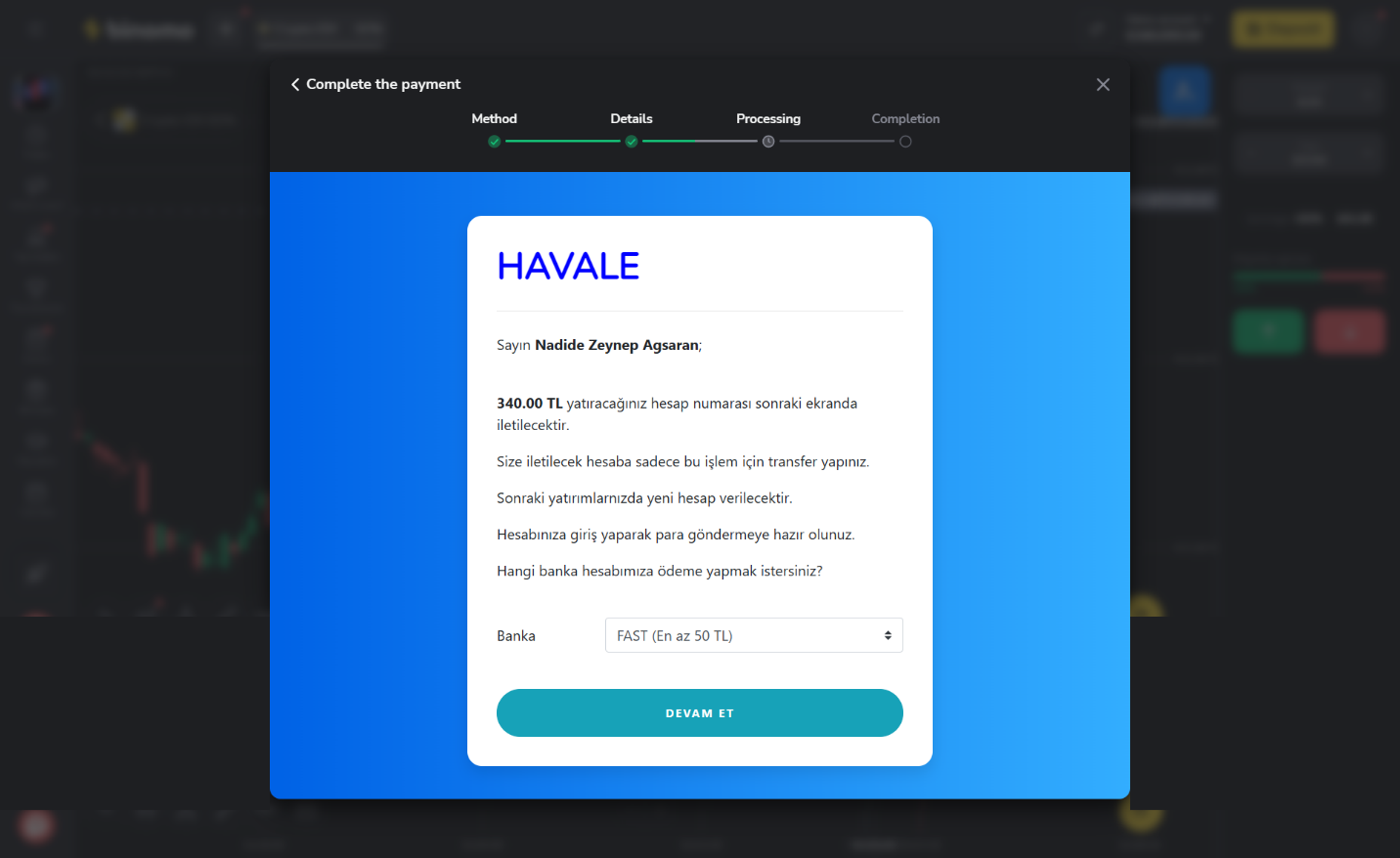 2. On the next page, click on the “HAVALE” button to choose HAVALE as your payment method, and fill out your information.