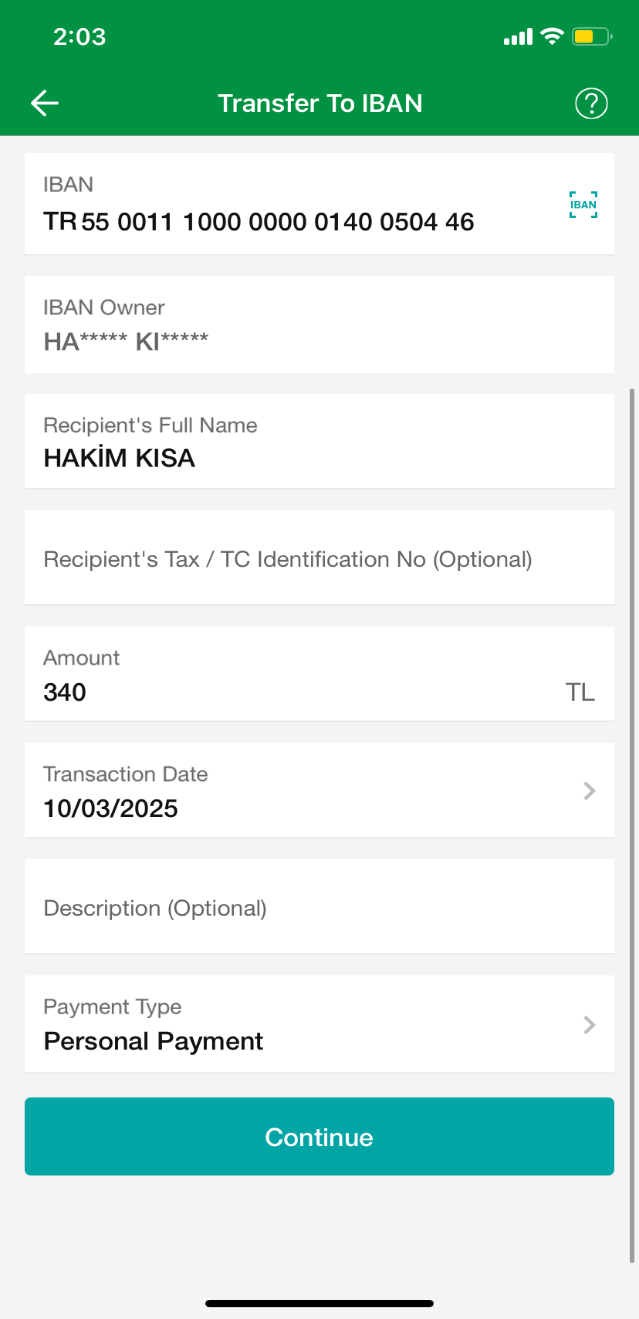 5. Open the Havale page on your banking app and paste or type the information provided by Binomo.