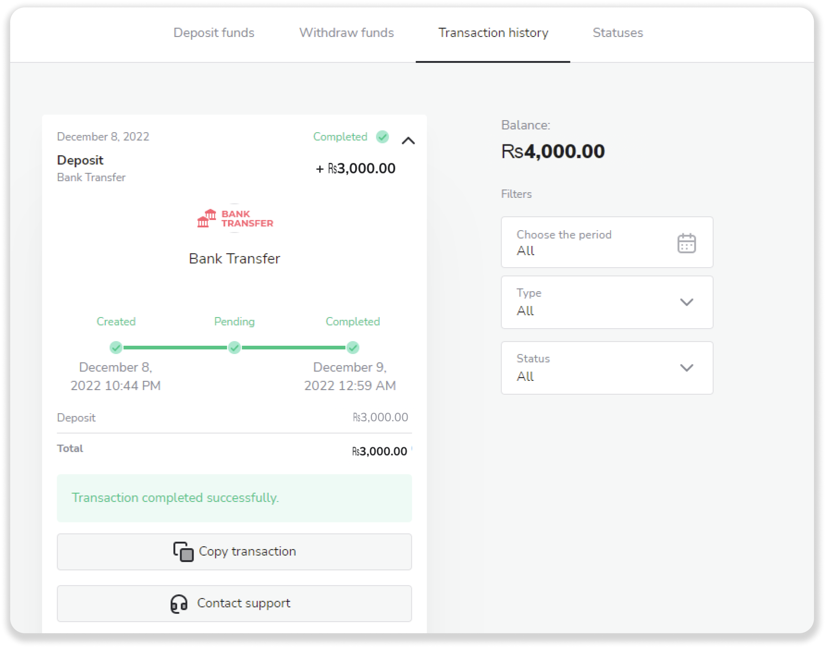 You can check the status of your transaction on the “Transaction history” tab on Binomo.