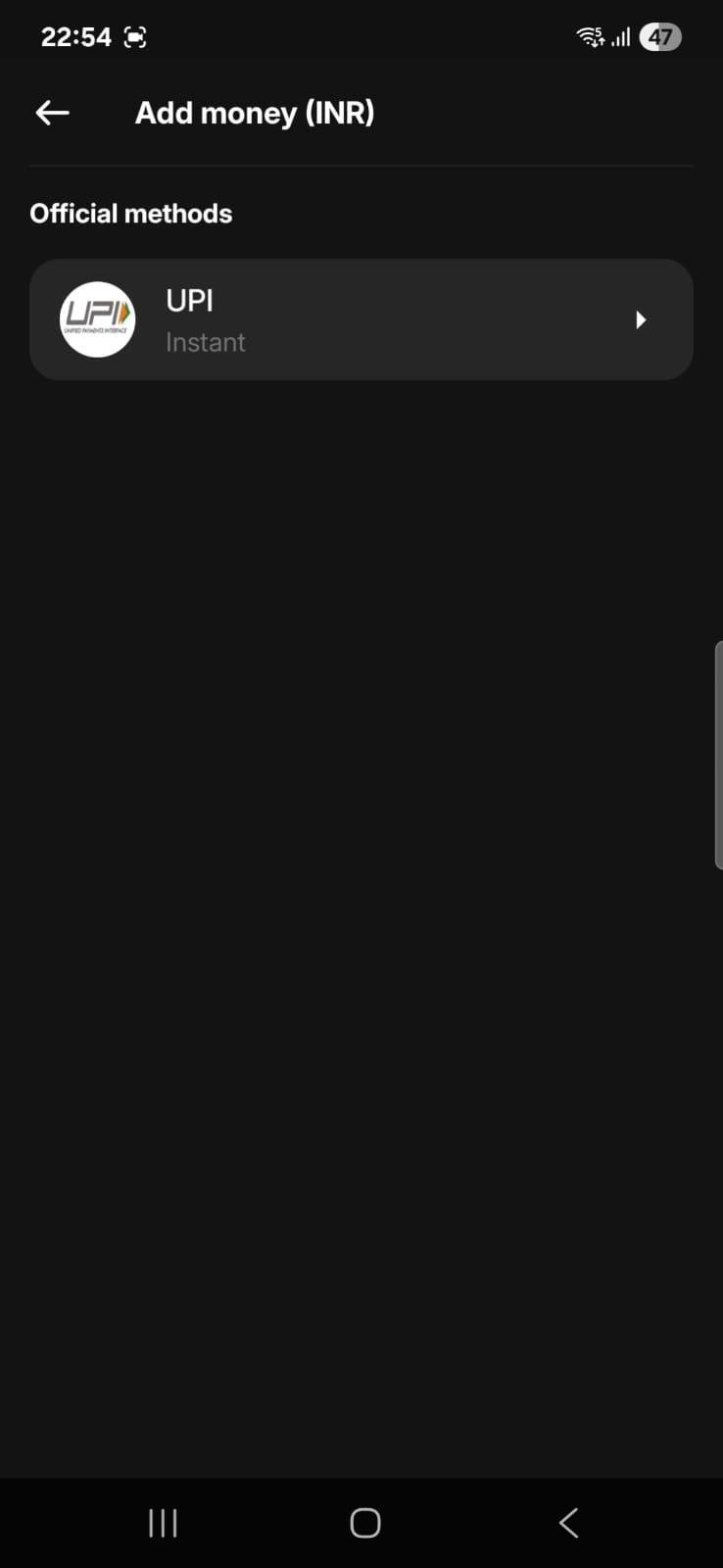 7. On the next screen select UPI option from “Add Money(INR)” screen: