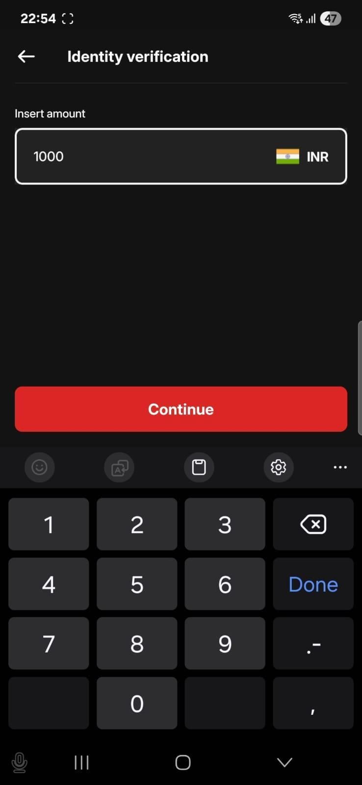 8. On the next screen “Identity verification” screen insert the amount and click on Continue button: