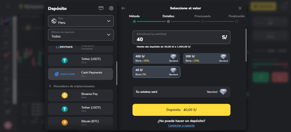 - Elija el país, en este caso Perú, y el método de pago CASH Y ATM (Cash Payments), luego elija el monto a depositar.