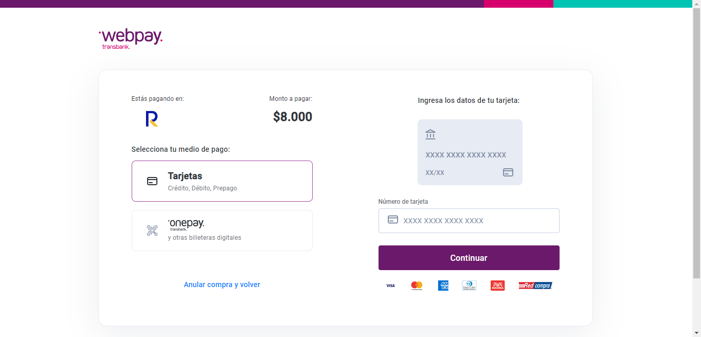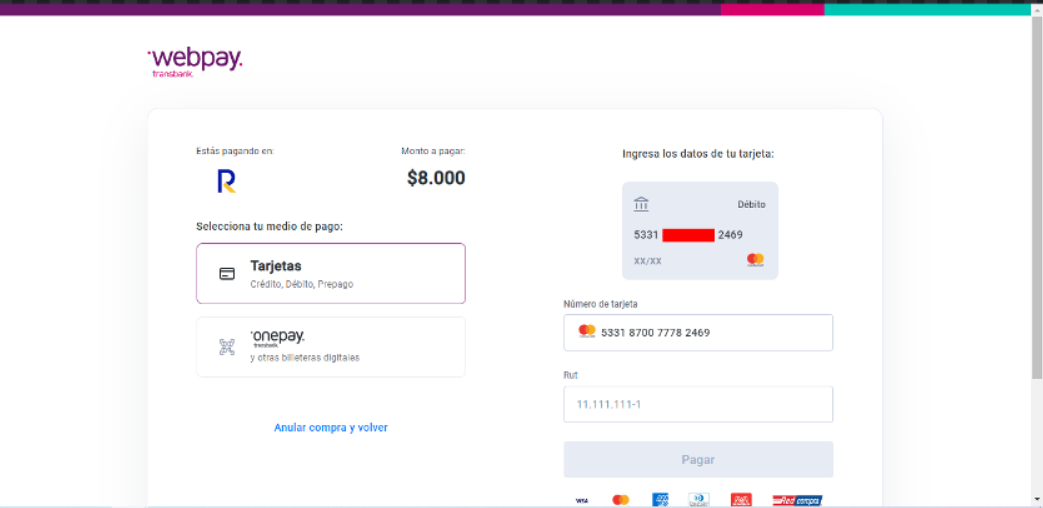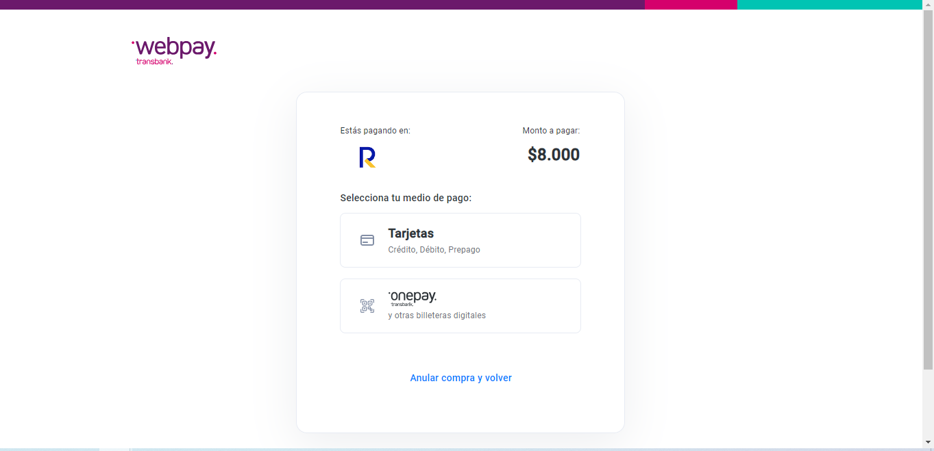 Paso 5: A continuación, se direccionará a la página Webpay. Seleccione el método de pago “Tarjetas” u “Onepay”.