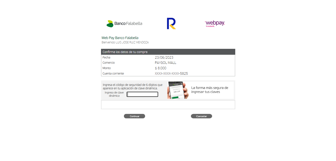 Paso 5.1.3: A continuación, se redirigirá a la página del banco que se esté utilizando. Ingrese los datos de seguridad solicitados y continúe con el proceso de pago.