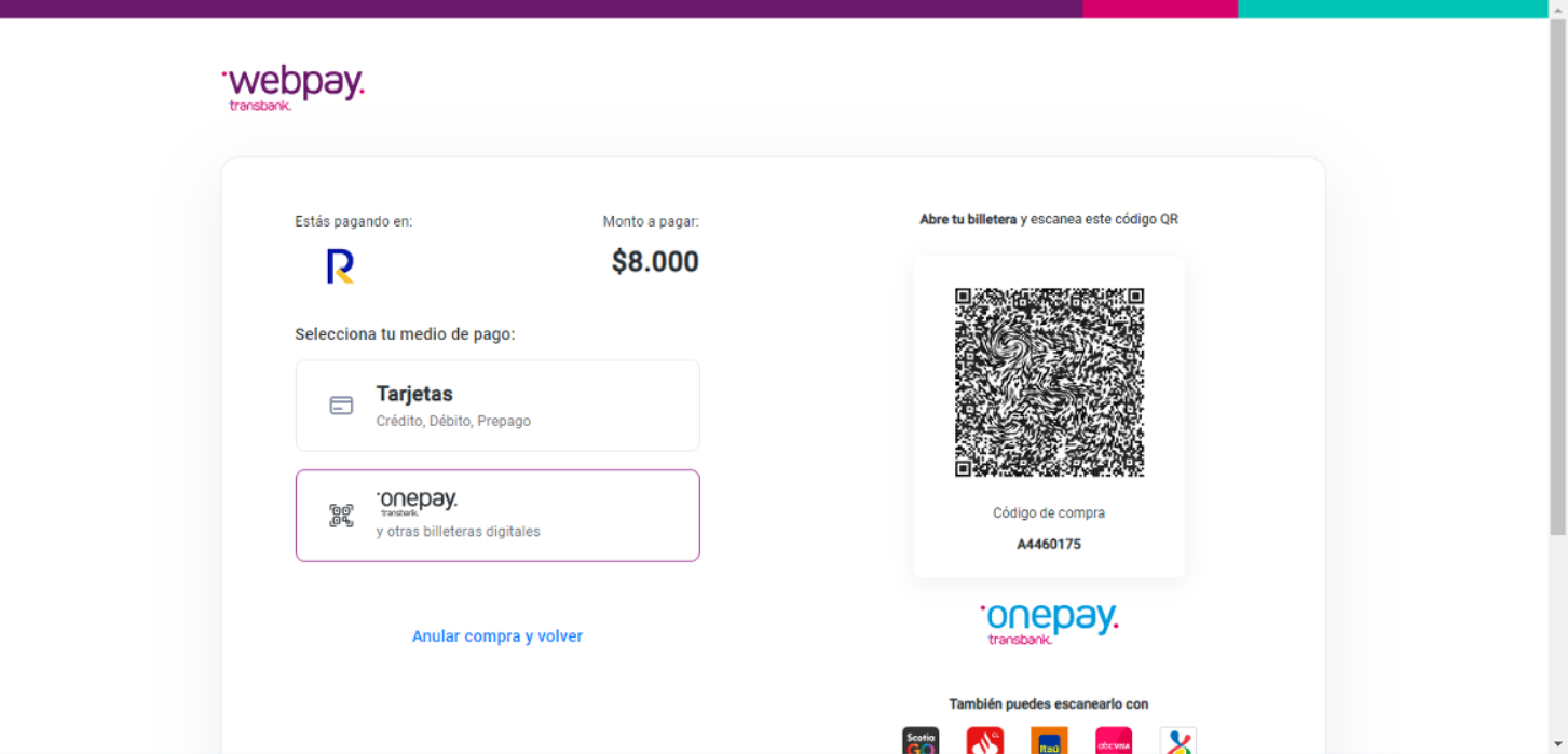 Paso 5.2.1: En caso de seleccionar “Onepay”, se desplegará un código QR para ser escaneado desde la App “Onepay” en su dispositivo móvil.