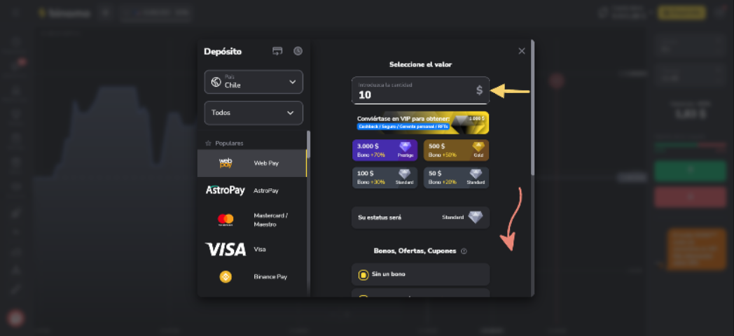 Paso 4: Posteriormente, ingrese la cantidad de su preferencia a depositar (cantidad mínima 8.000 Ch$) y haga clic en el botón amarillo “Depósito xxxxx Ch$”.