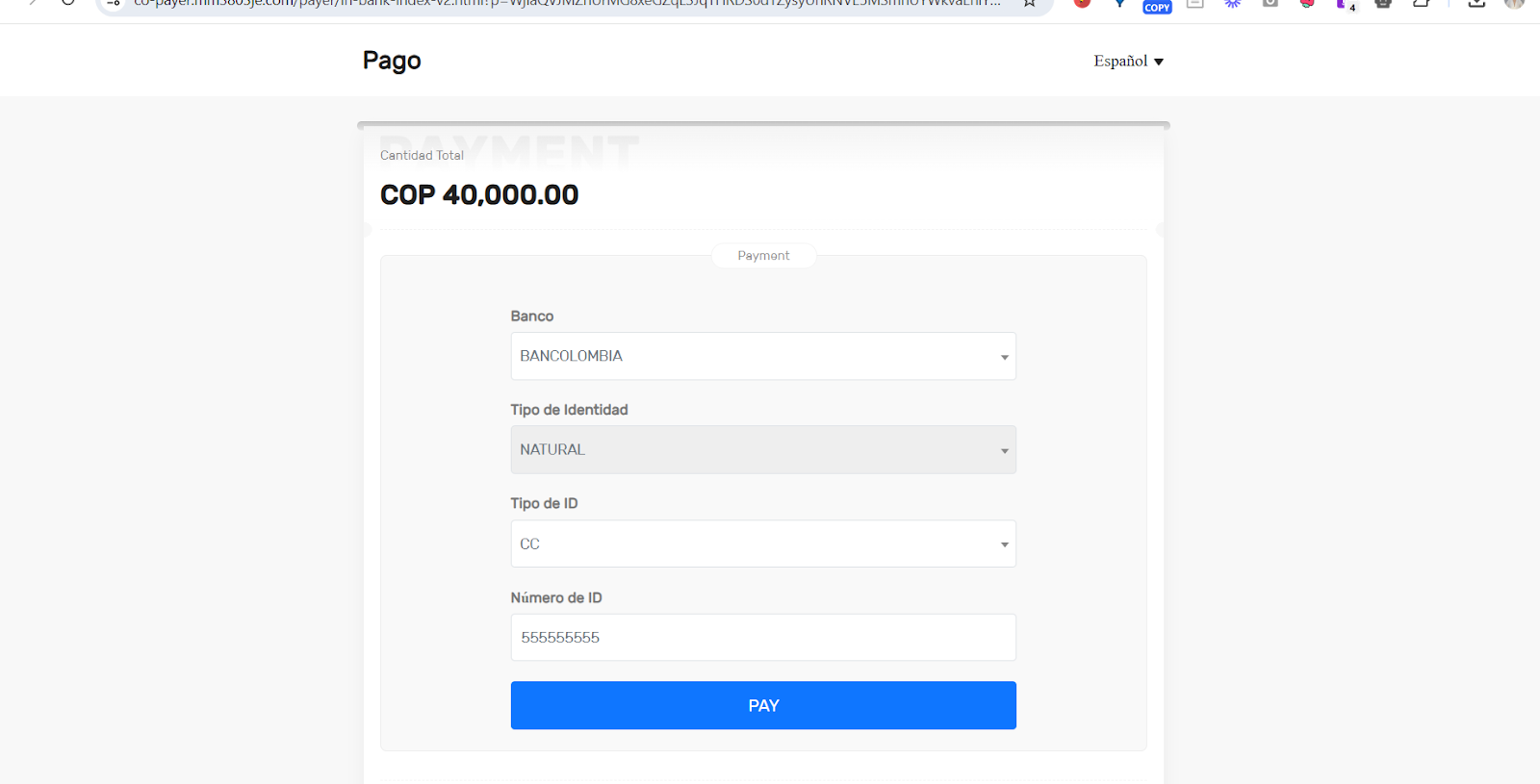 Paso 5: Será redirigido a la página de pagos. Seleccione su banco, tipo de persona, tipo de identificación, ingrese su número de identificación y haga clic en “PAY”.