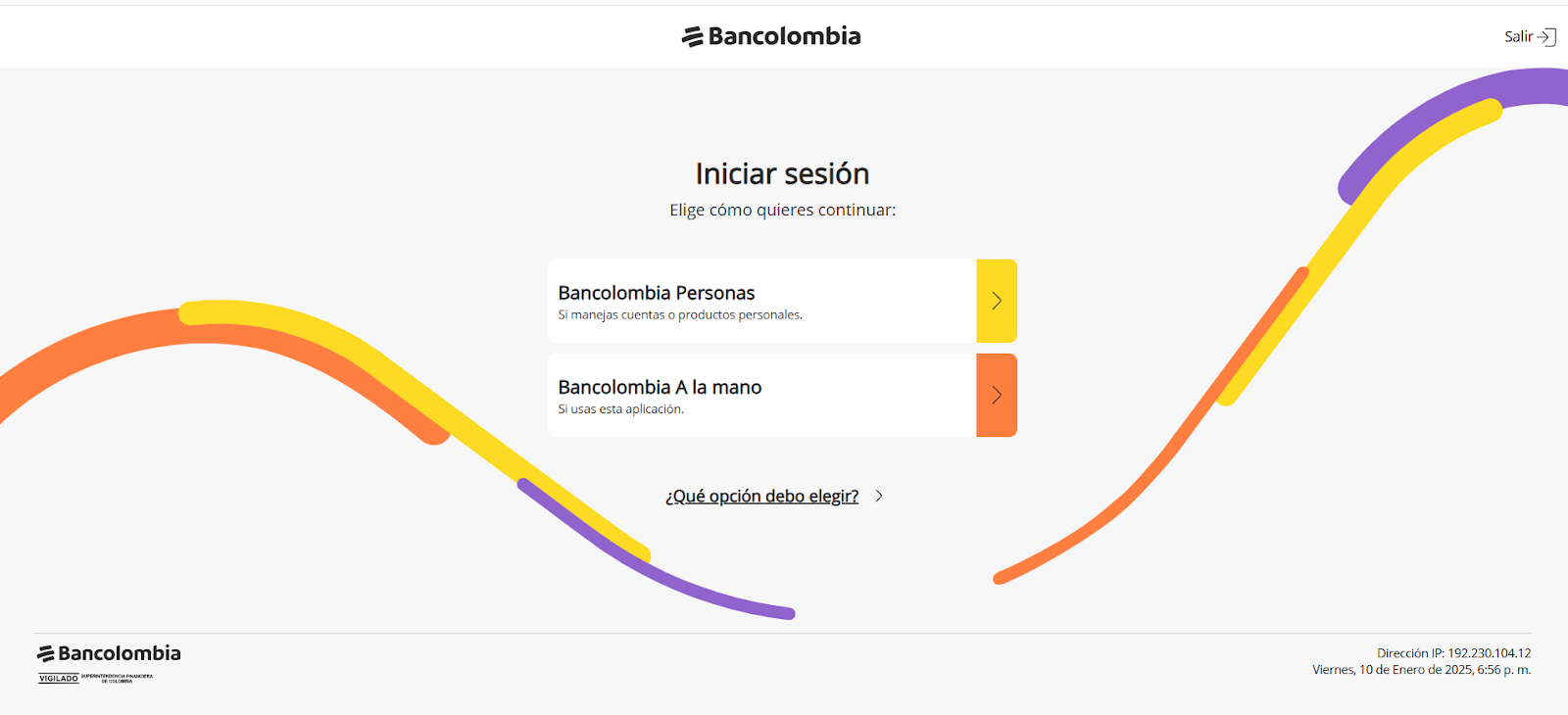Paso 7: Realice el proceso de pago a través de su entidad bancaria. En el caso de Bancolombia, seleccione el tipo de cuenta, ya sea “Bancolombia Personas” o “Bancolombia A la Mano”.
