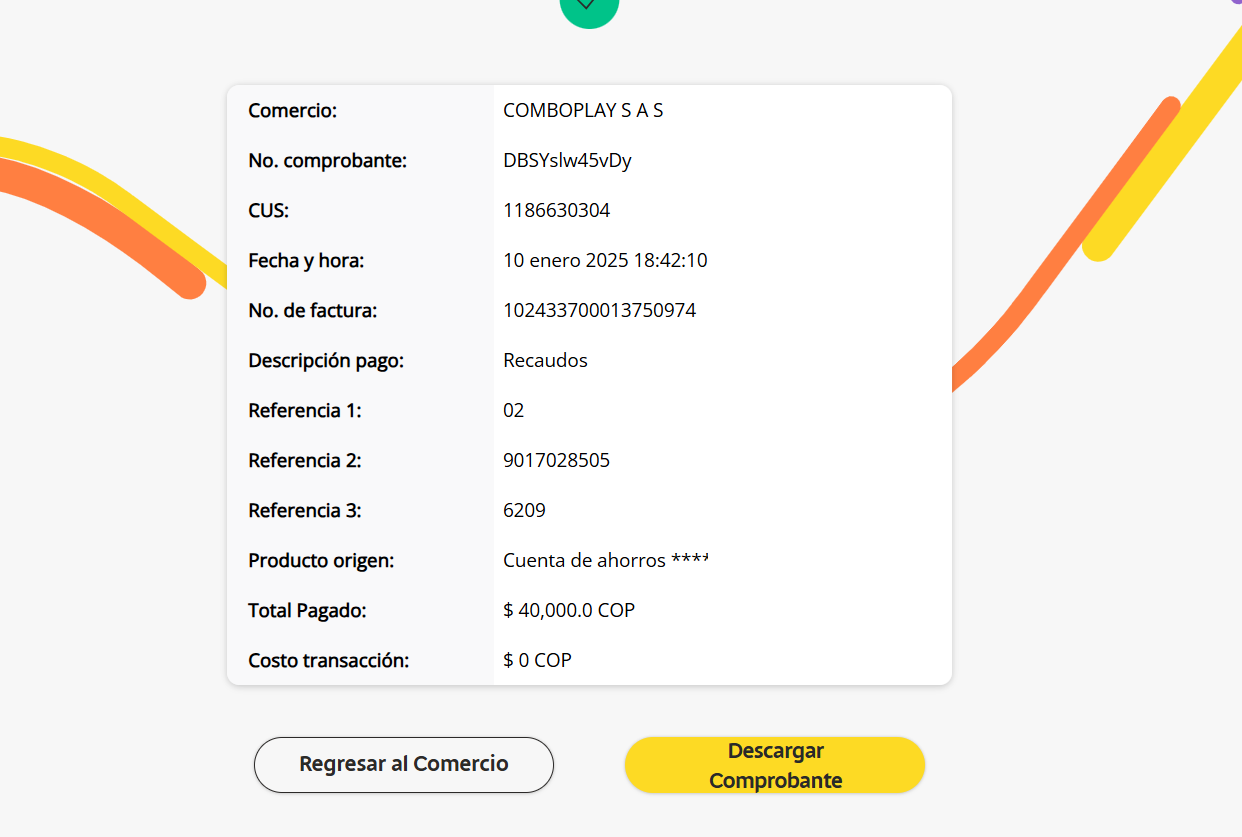 Paso 12: Este es el comprobante de pago emitido por Bancolombia. Haga clic en “Regresar al comercio”.