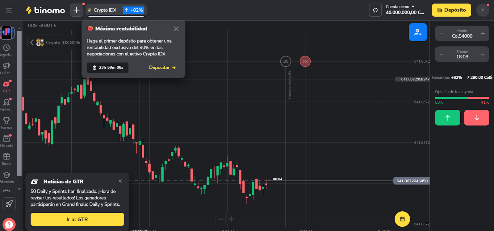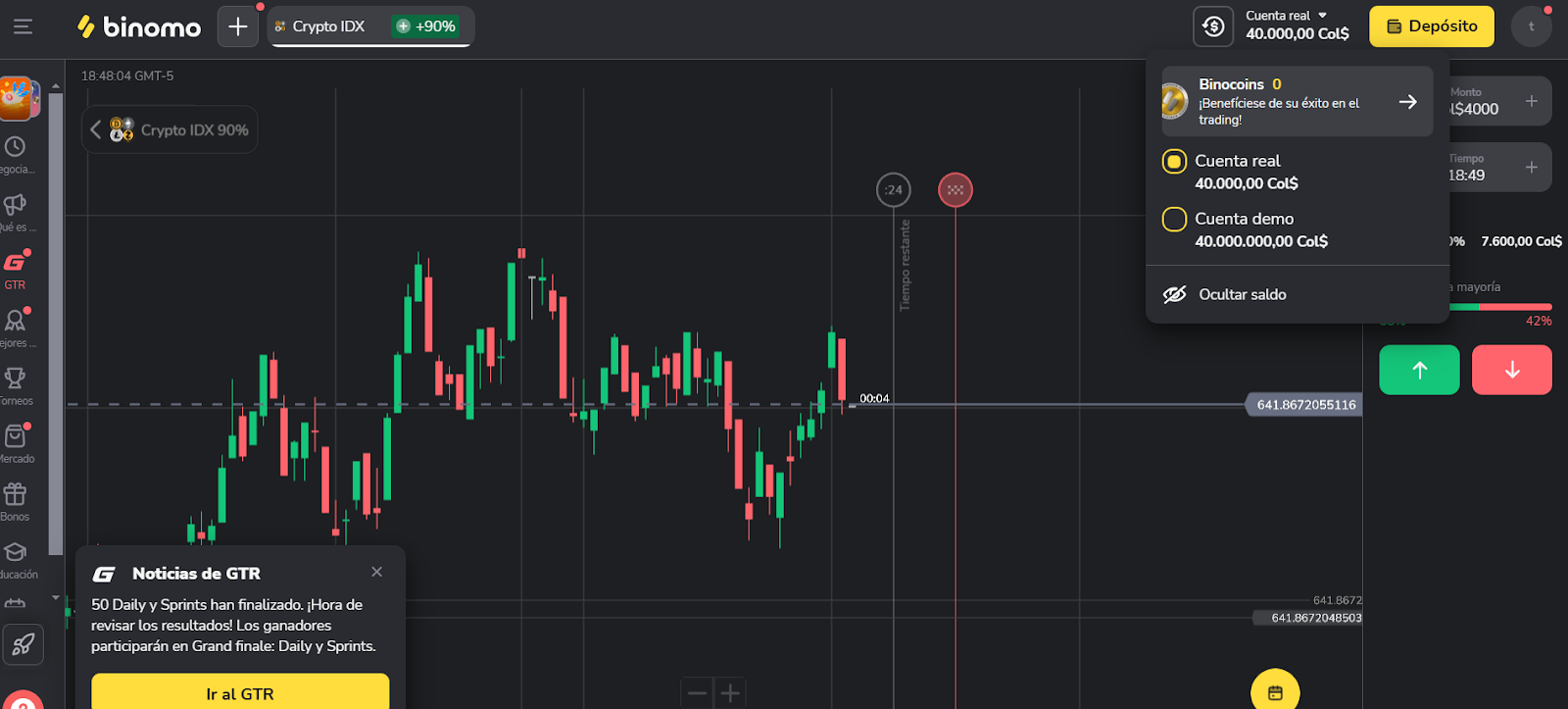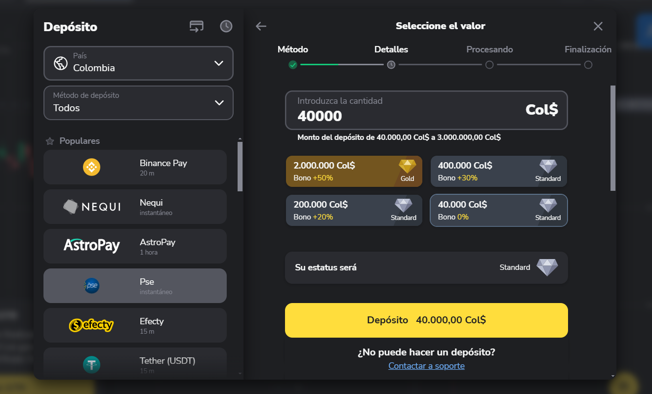 Paso 1: Inicie sesión en su cuenta Binomo y haga clic en el botón amarillo “Depósito”, ubicado en la esquina superior derecha de la pantalla de inicio.