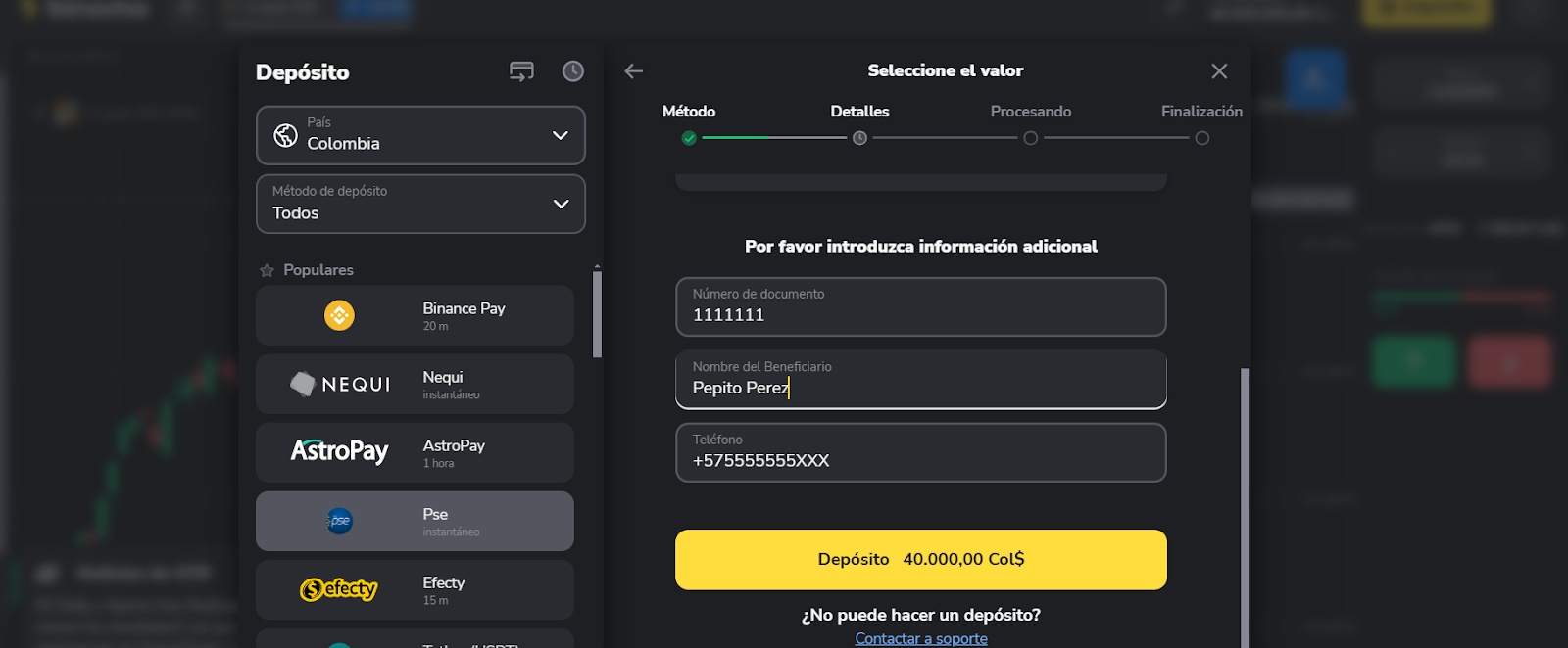 Paso 4: Complete los siguientes campos: número de documento, nombre del beneficiario y número de teléfono. Luego, haga clic en “Depósito”.