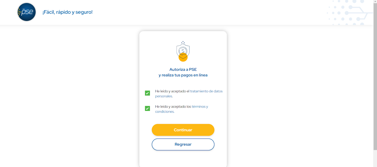 Paso 6: Será redirigido a la página de PSE. Marque las casillas junto a “He leído y aceptado el tratamiento de datos personales” y “He leído y aceptado los términos y condiciones”, luego haga clic en “Continuar”.
