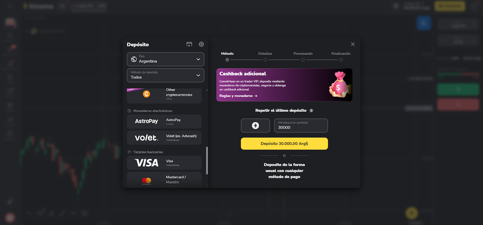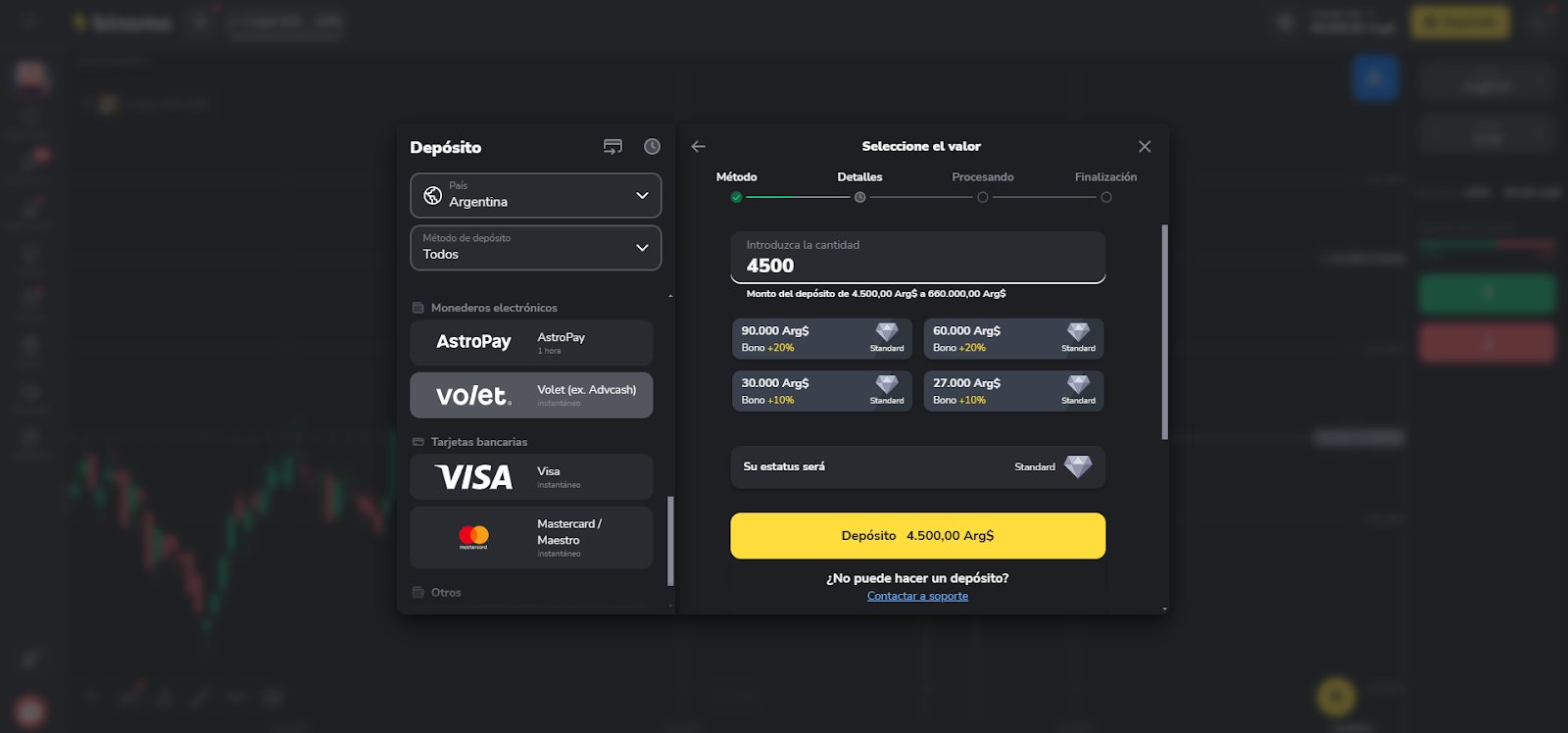 PASO 4: Ingrese el monto mínimo de depósito (4.500 ARS) y haga clic en el botón amarillo "Depósito 4.500,00 Arg$".