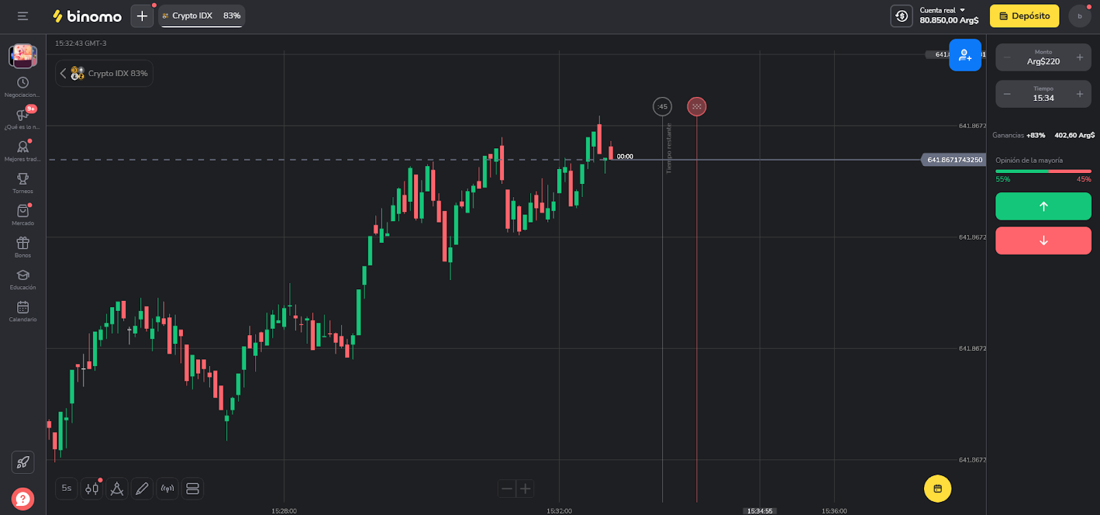 PASO 12: Será redirigido nuevamente a Binomo, donde podrá visualizar la transacción realizada en el "Historial de Transacciones".