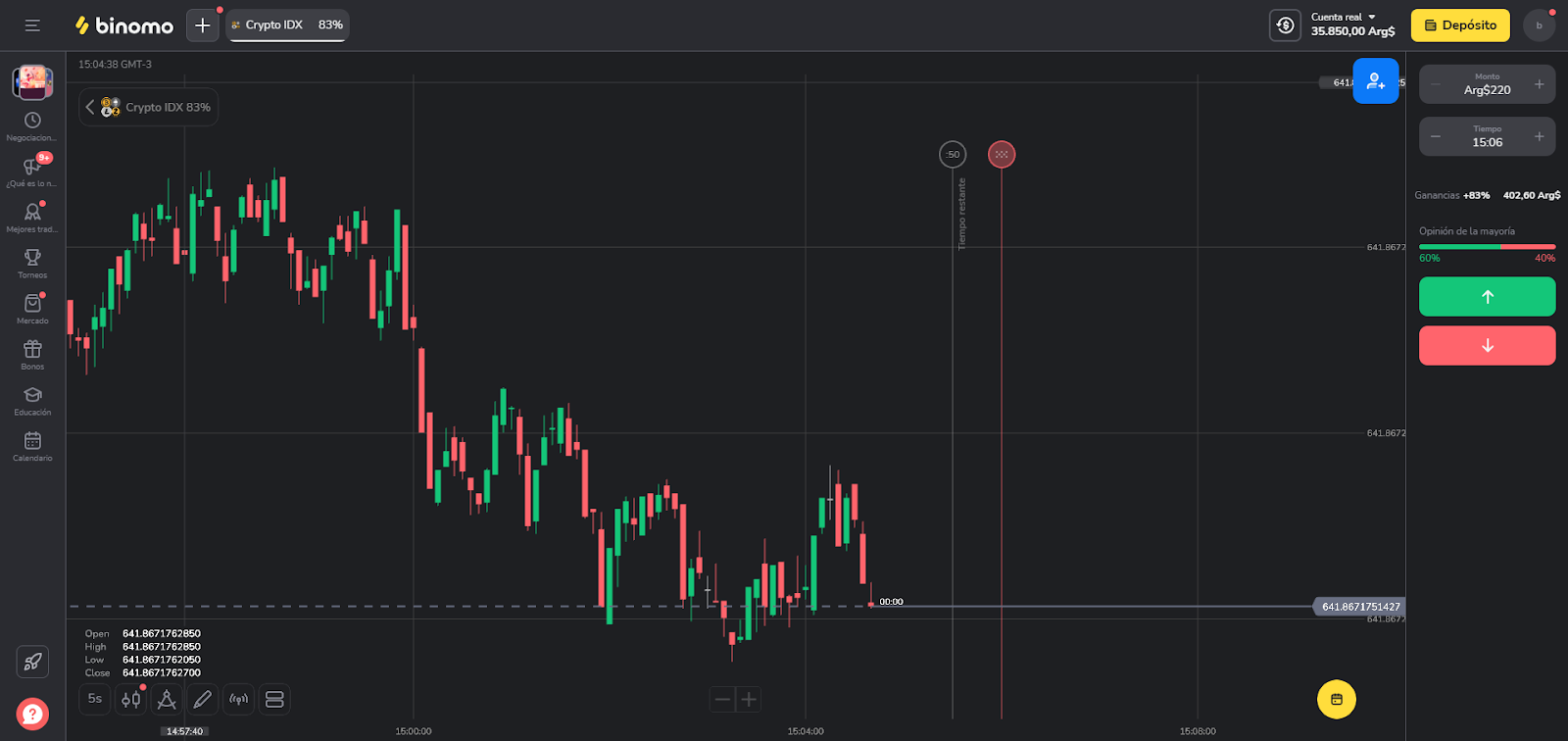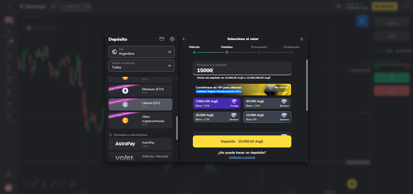 PASO 4: Ingrese el monto mínimo de depósito (15.000 ARS) y haga clic en el botón amarillo "Depósito 15.000,00 Arg$".