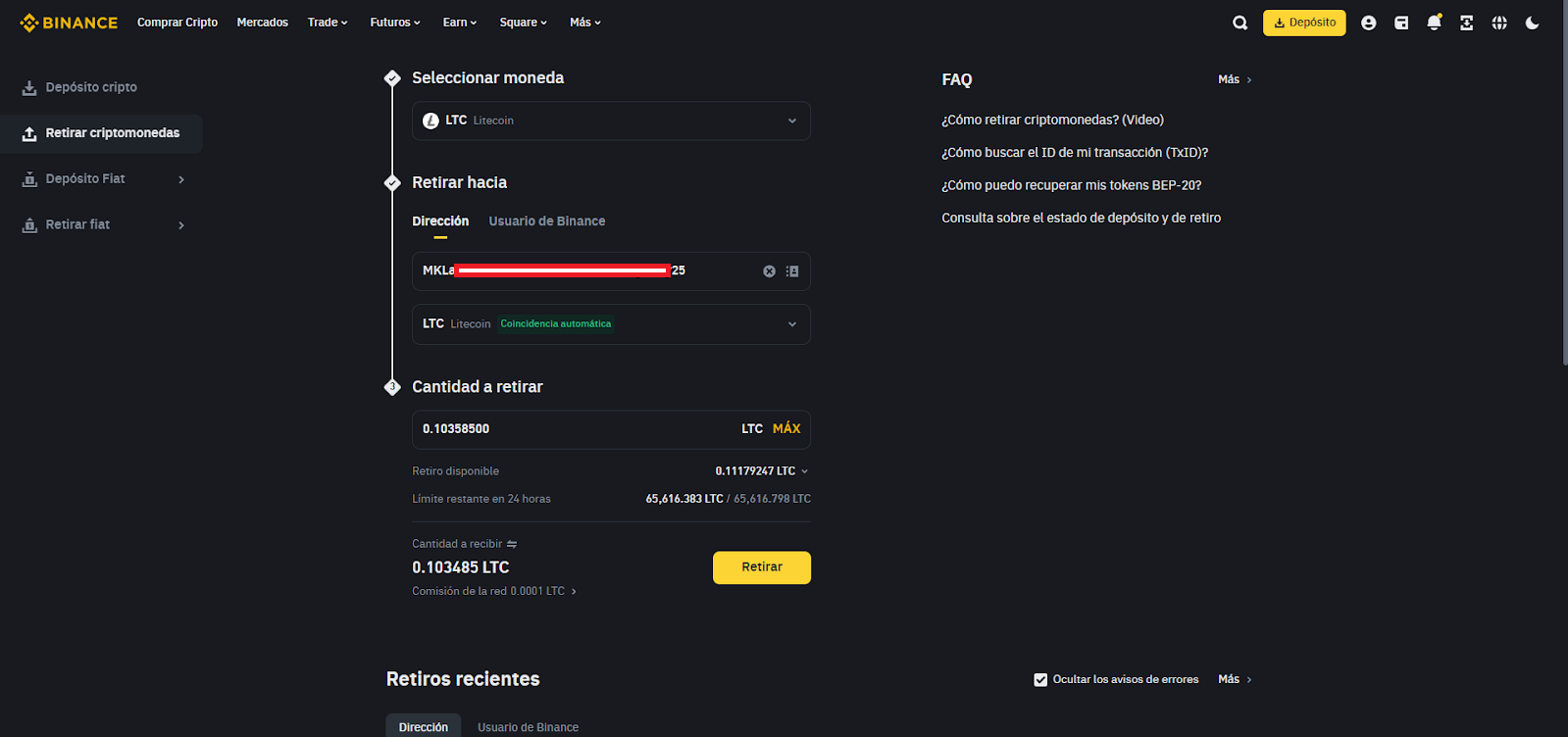 PASO 10: Ingrese la dirección LTC de Binomo, seleccione la red solicitada (LTC) y el monto a retirar, teniendo en cuenta la tarifa de 0.0001 LTC que cobra la red. Luego, haga clic en el botón "Retirar".