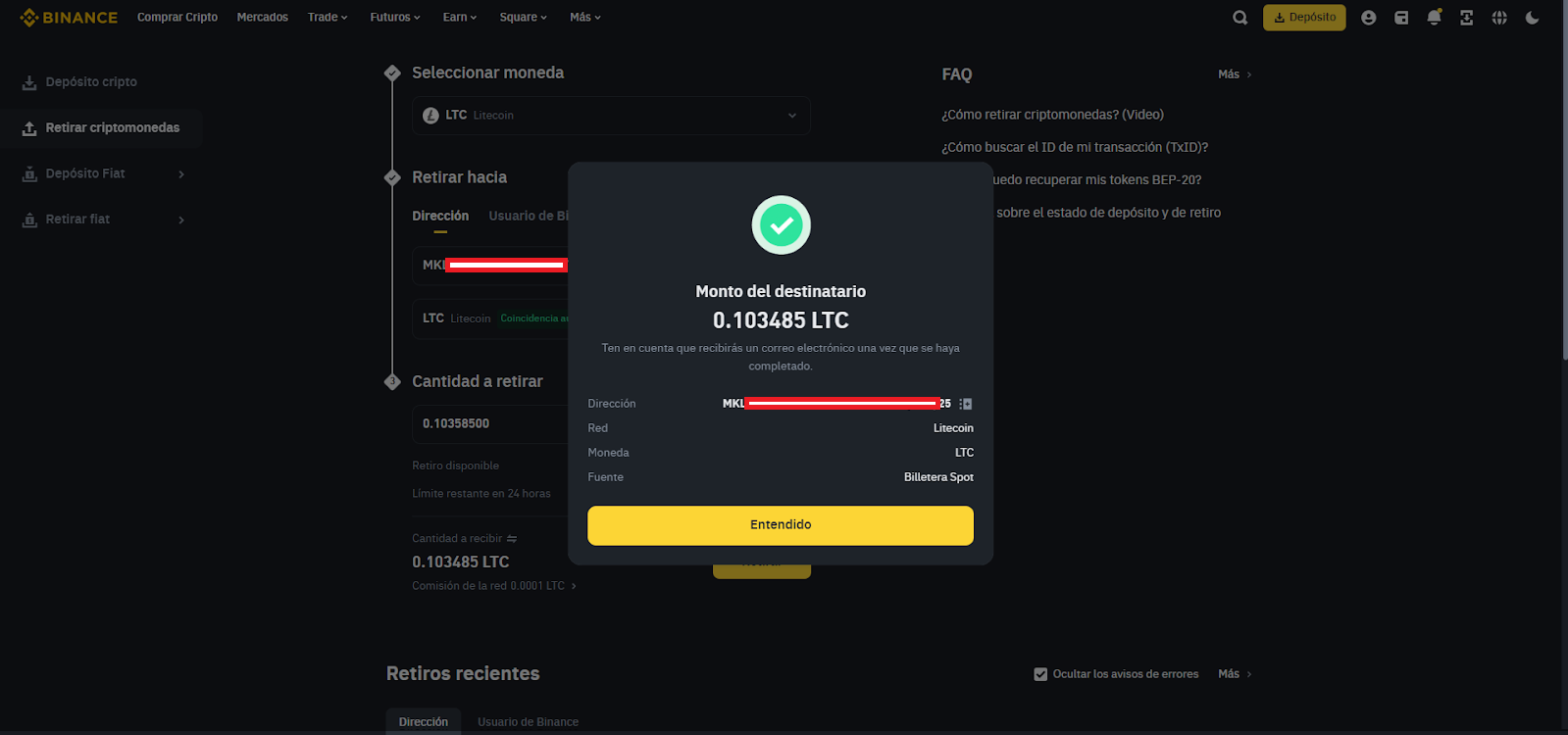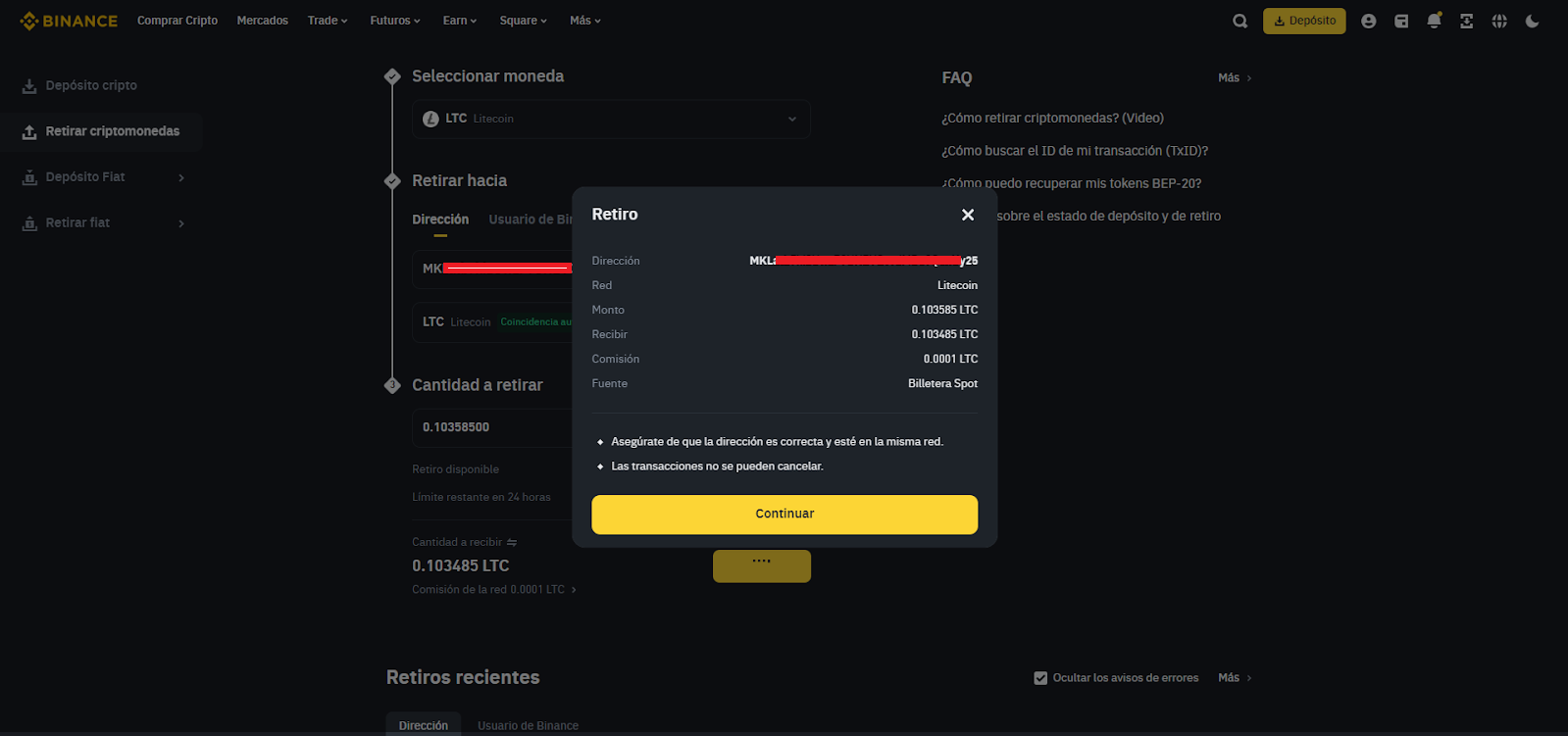 PASO 5: Copie la dirección LTC que se muestra en la pantalla y diríjase a la plataforma desde la cual realizará el pago (Binance).