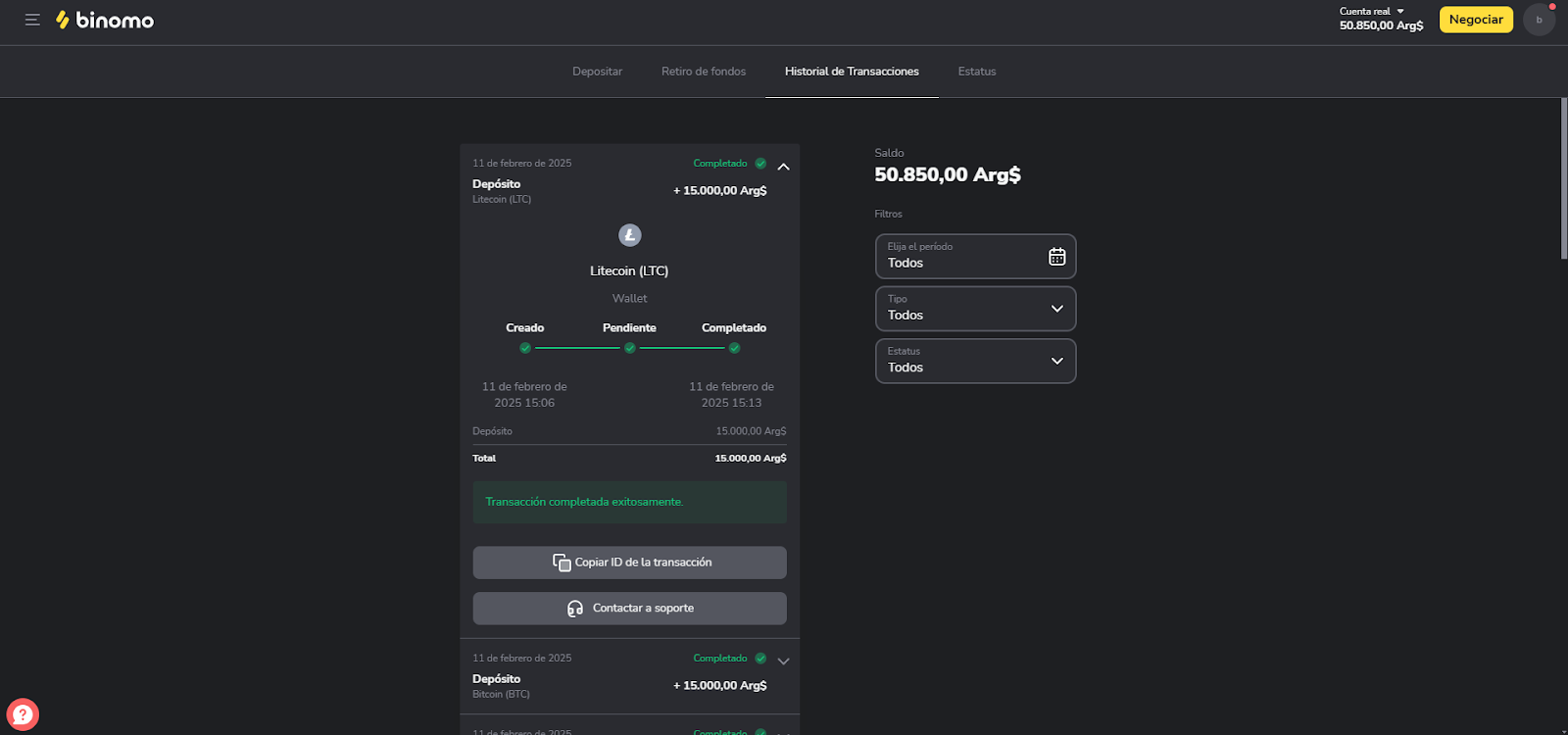 PASO 13: Una vez en Binomo, podrá visualizar la transacción realizada en la sección "Historial de Transacciones".