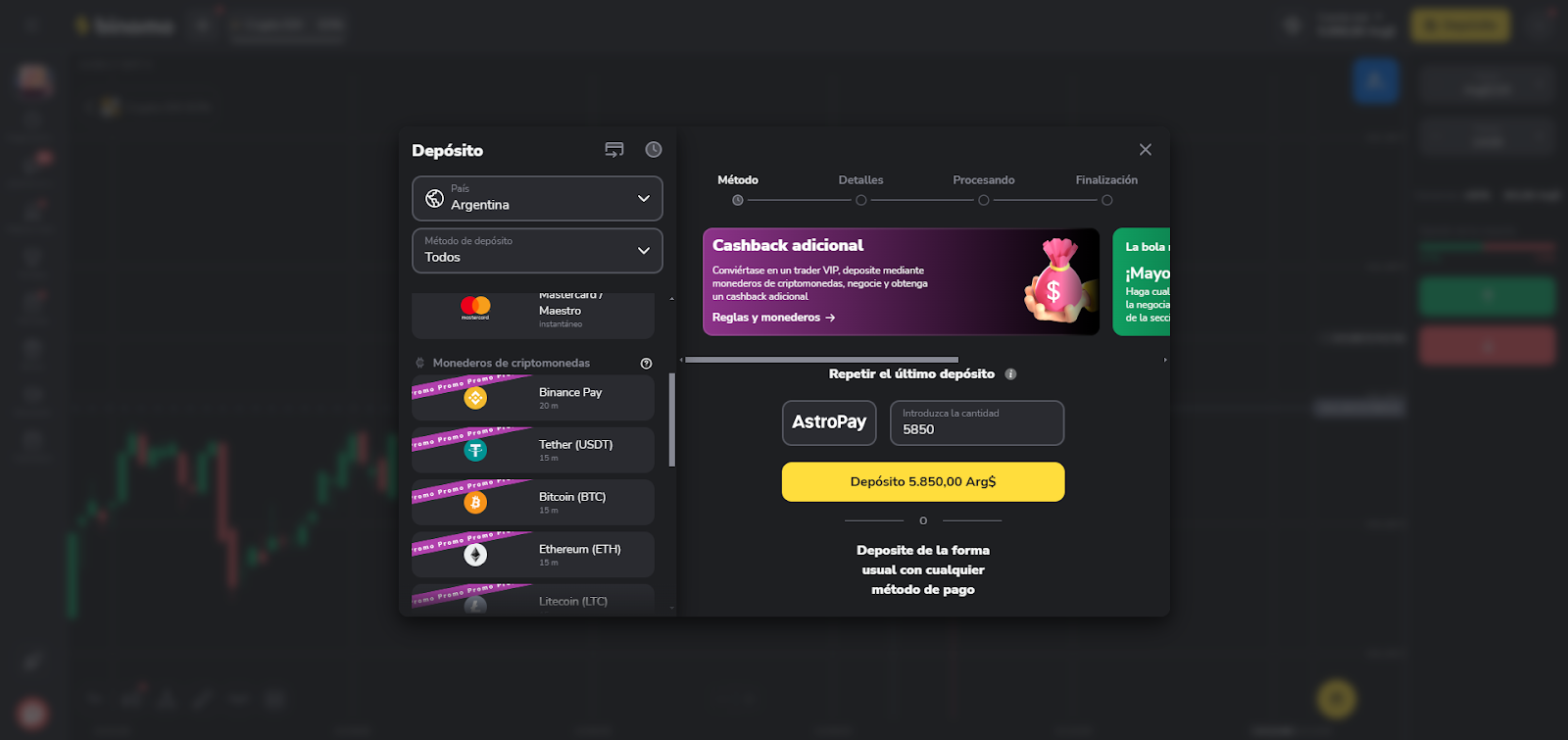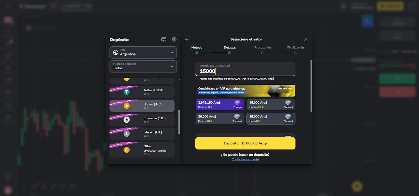 PASO 4: Ingrese el monto mínimo de depósito (15.000 ARS) y haga clic en el botón amarillo "Depósito 15.000,00 Arg$".