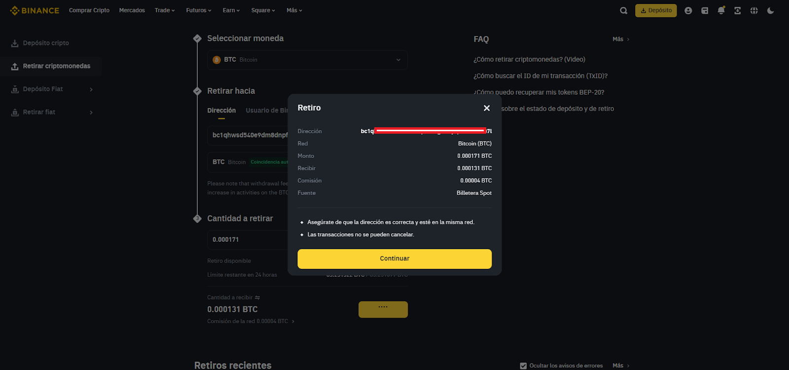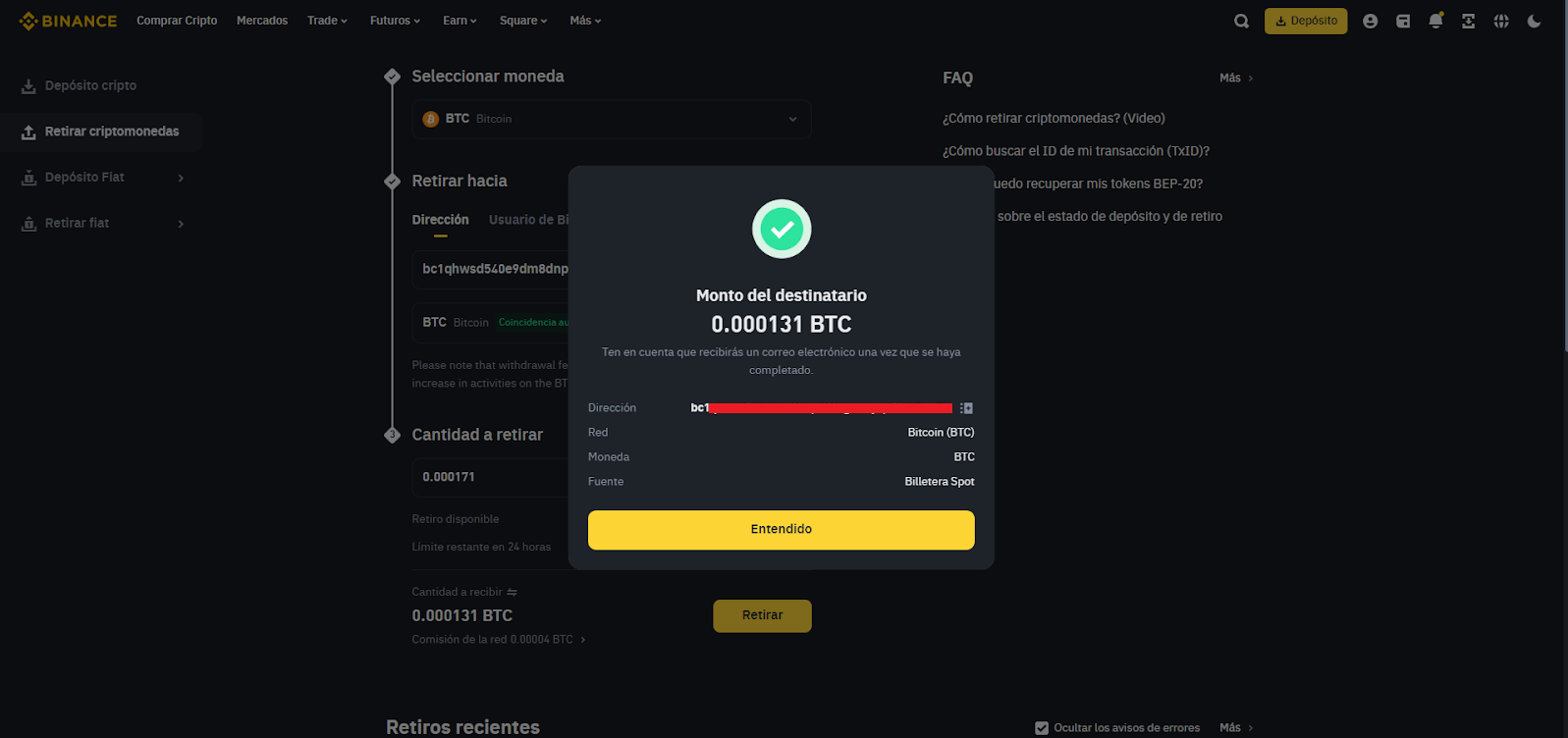 PASO 5: Copie la dirección BTC que se muestra en la pantalla y diríjase a la plataforma desde la cual realizará el pago (Binance).