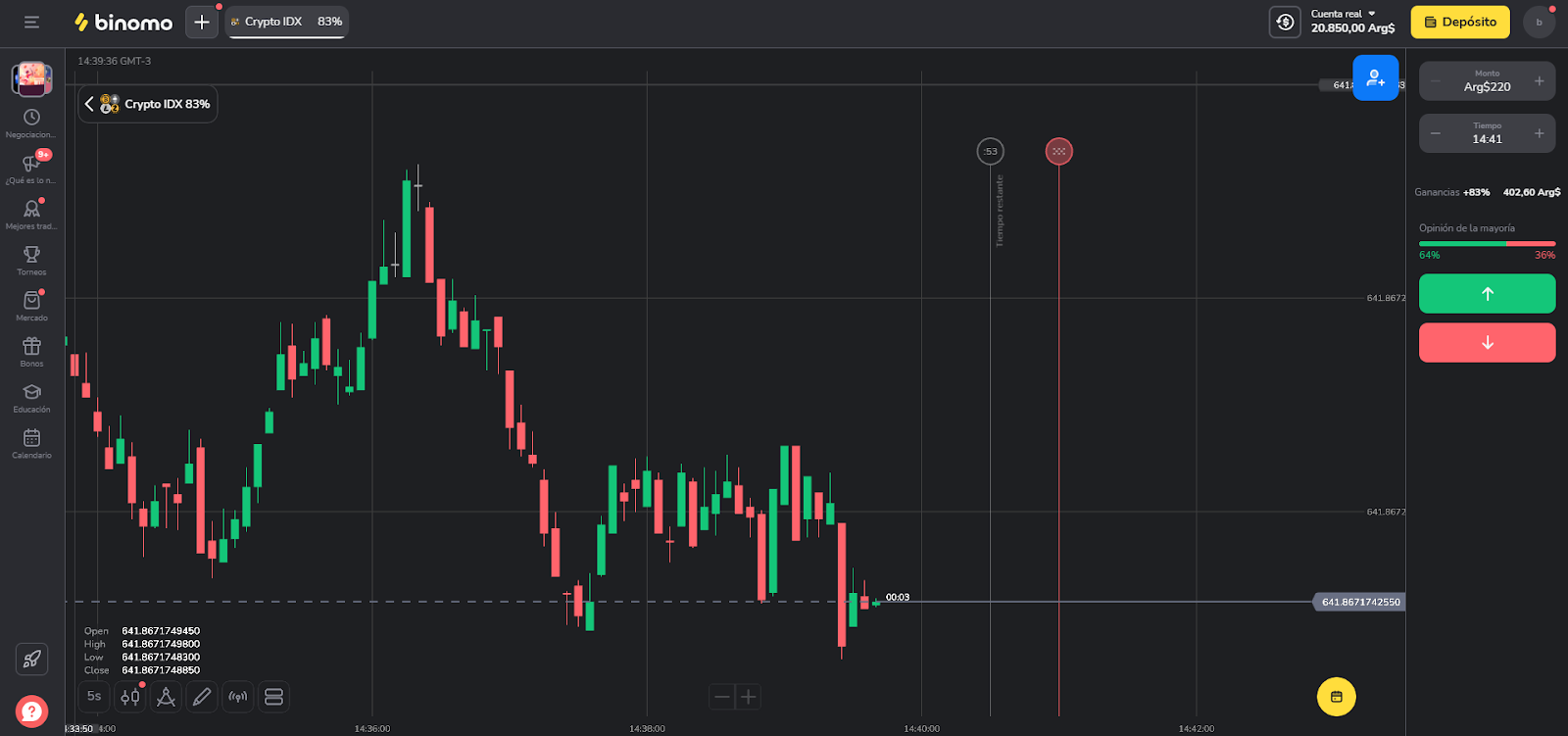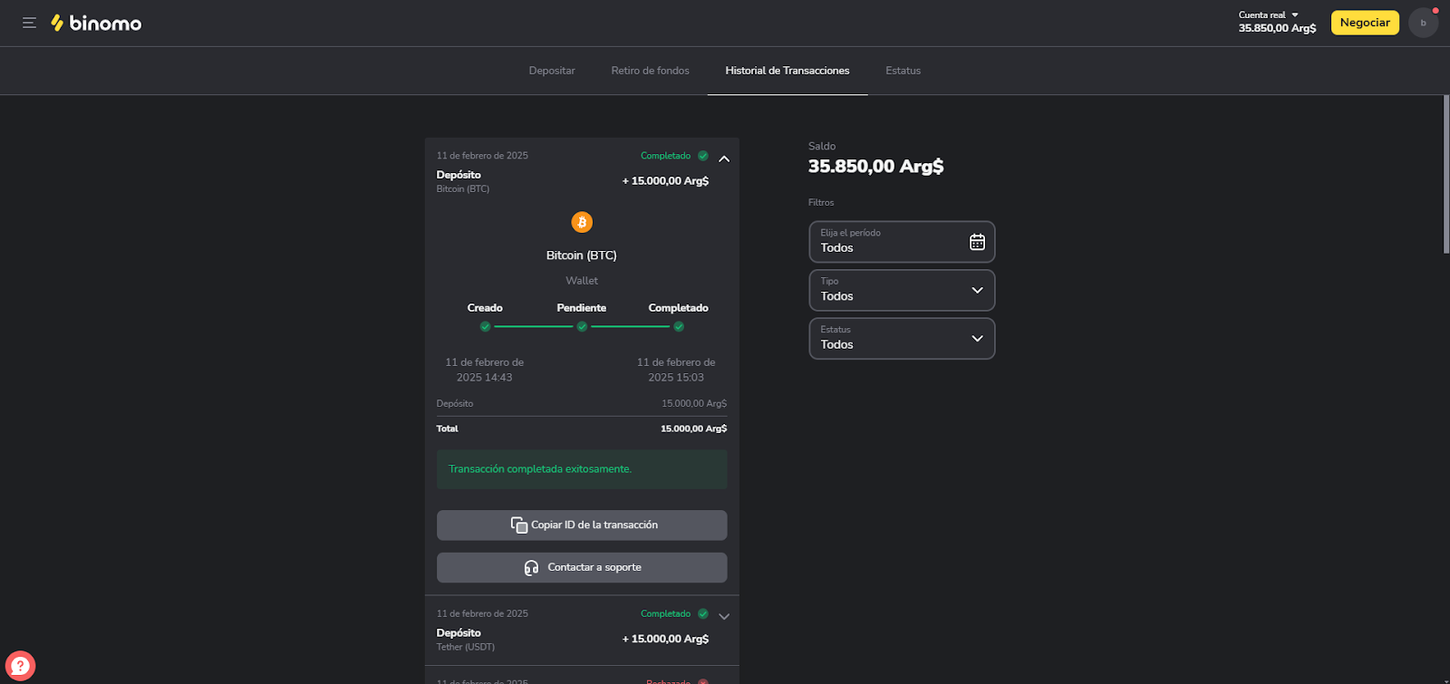 PASO 13: Una vez en Binomo, podrá visualizar la transacción realizada en la sección "Historial de Transacciones".