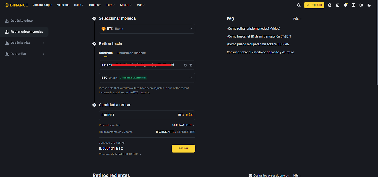PASO 10: Ingrese la dirección BTC de Binomo, seleccione la red solicitada (BTC) y el monto a retirar, teniendo en cuenta la tarifa de 0.00004 BTC que cobra la red. Luego, haga clic en el botón "Retirar".