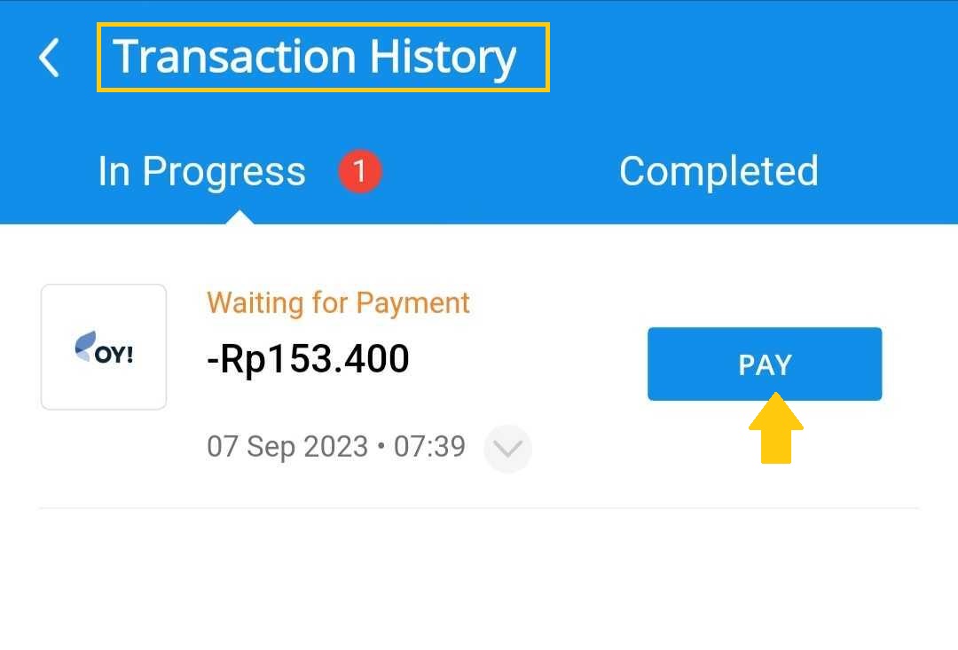 9. Temukan transaksi di halaman “Riwayat Transaksi (transaction history)” di aplikasi DANA Anda. Dan klik “bayar/pay”.