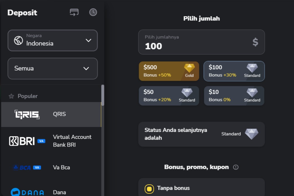 4. Jika Anda ingin melakukan deposit dengan bonus, klik pada salah satu pilihan di bawah.