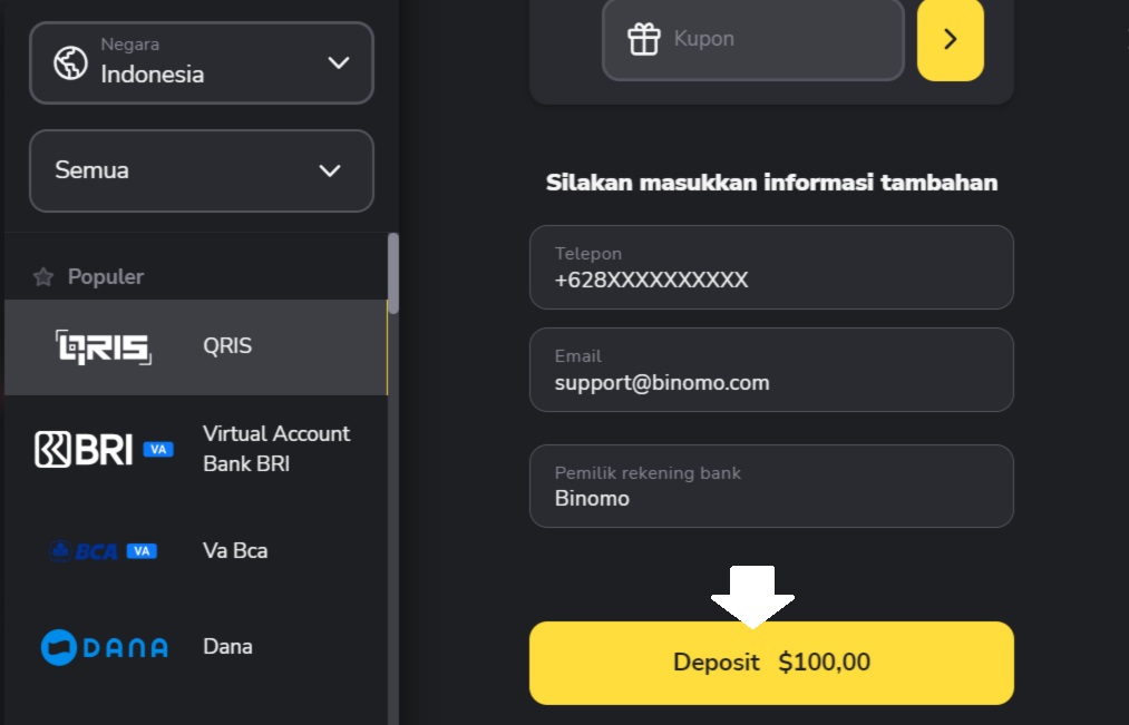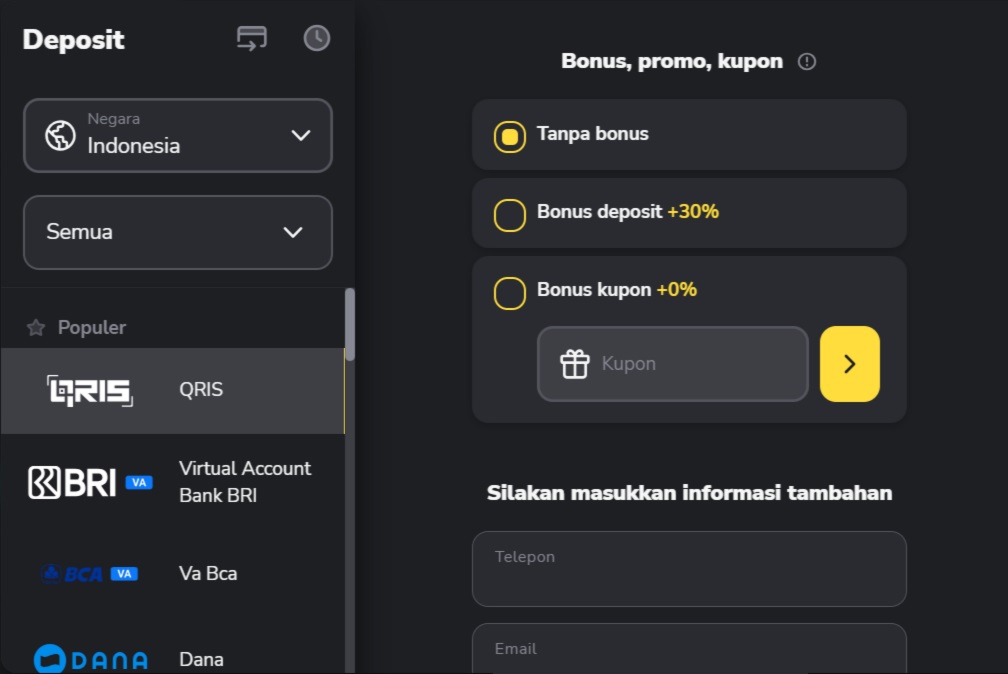 5. Masukan informasi tambahan, seperti nomor telepon (harus dalam format internasional), alamat email dan nama pemilik rekening QRIS. Apabila semua data sudah dimasukkan dengan benar, klik pada tombol Deposit berwarna kuning.