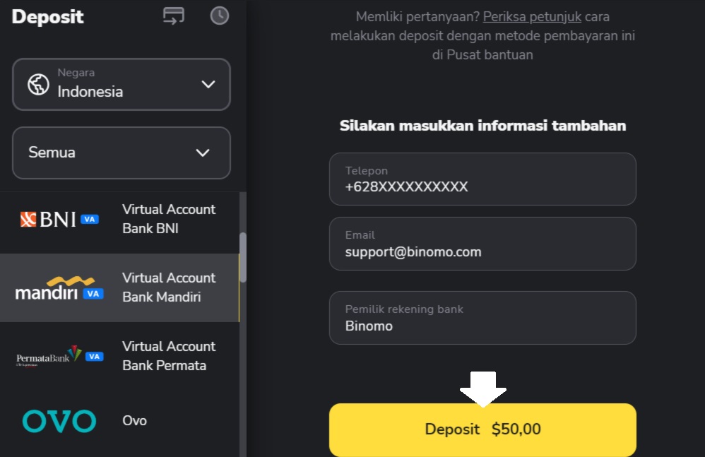 5. Masukan informasi tambahan, seperti nomor telepon (harus dalam format internasional), alamat email dan nama pemilik rekening. Apabila semua data sudah dimasukkan dengan benar, klik pada tombol Deposit berwarna kuning.
