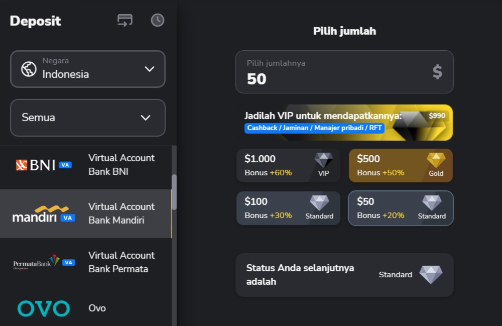 4. Jika Anda ingin melakukan deposit dengan bonus, klik pada salah satu pilihan di bawah.