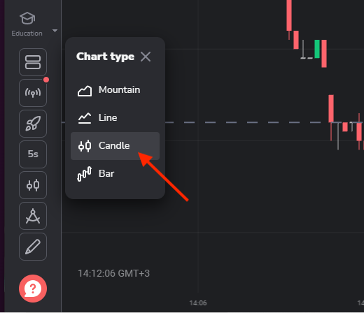 Untuk memilih jenis grafik, klik ikon grafik di sudut kiri bawah platform. Ada 4 jenis grafik: Gunung, Garis, Lilin, dan Batang.