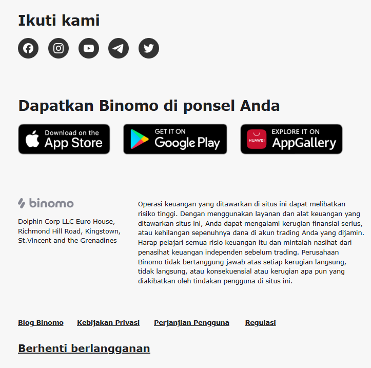 - Anda selalu dapat berhenti berlangganan buletin dengan menekan tombol “Berhenti berlangganan” yang terdapat pada bagian bawah setiap email dari Binomo.