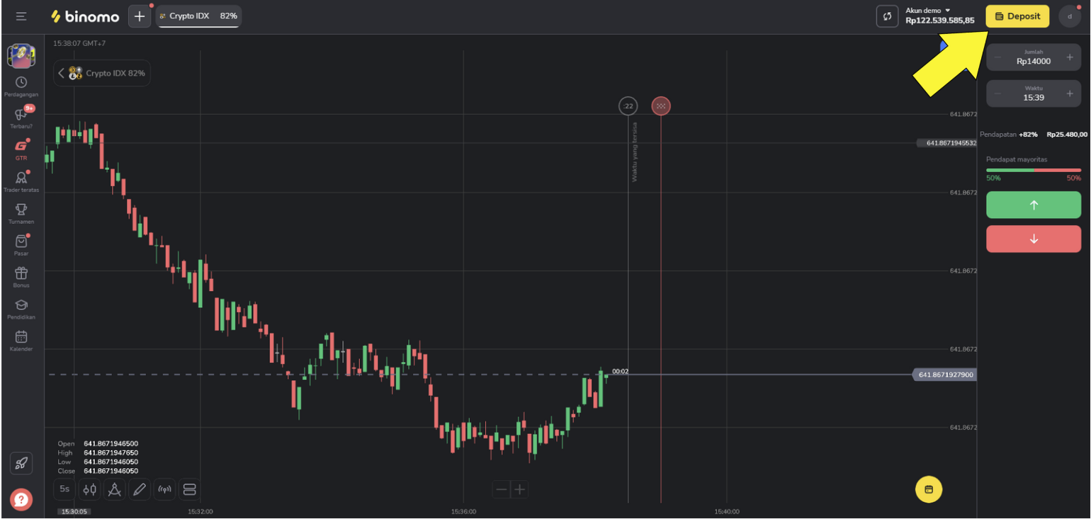 Di ruang perdagangan, klik tombol "Deposit" di sudut kanan atas layar.