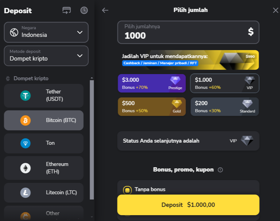 Anda dapat melakukan deposit di Binomo dengan salah satu mata uang kripto berikut: