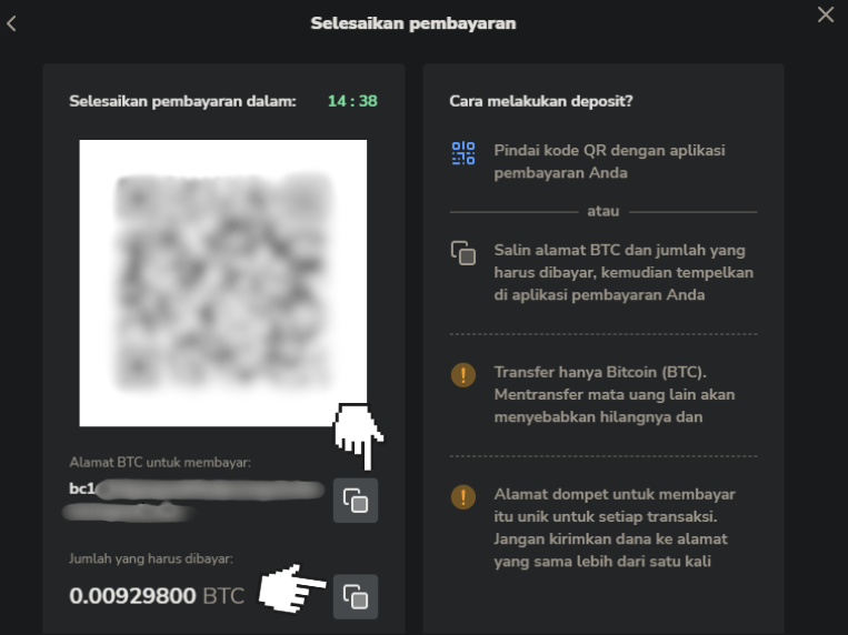 Catatan. Pastikan untuk memeriksa apakah nama mata uang kripto yang Anda kirim sesuai dengan nama mata uang di kolom "alamat untuk membayar". Jika tidak, kami tidak akan menerima transaksi Anda. Misalnya, jika Anda mengirim BTC ke alamat BCH, dana ini tidak akan dapat dipulihkan.